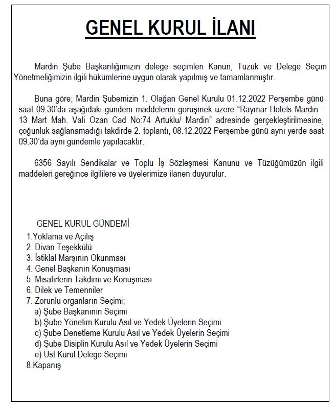 MARDİN ŞUBE BAŞKANLIĞI GENEL KURUL İLANI