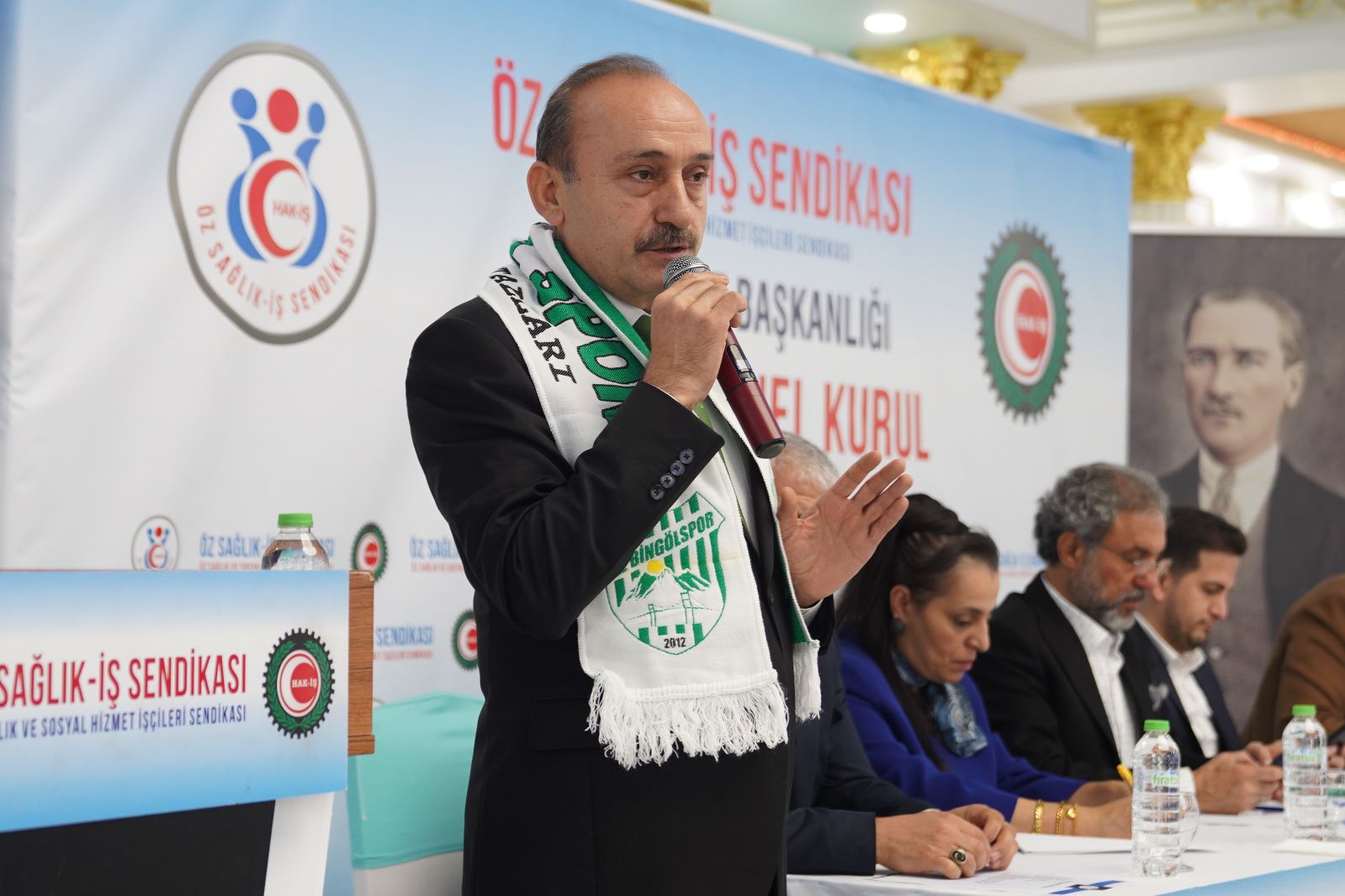 “Bugün iki bayramı birden yaşıyoruz. İlki Müslümanların Cuma günü, ikincisi  Öz Sağlık İş Sendikası Bingöl Şubesi’nin 1. Olağan Genel Kurulu. Genel Kurulun camiamıza hayırlı olmasını dilerim.