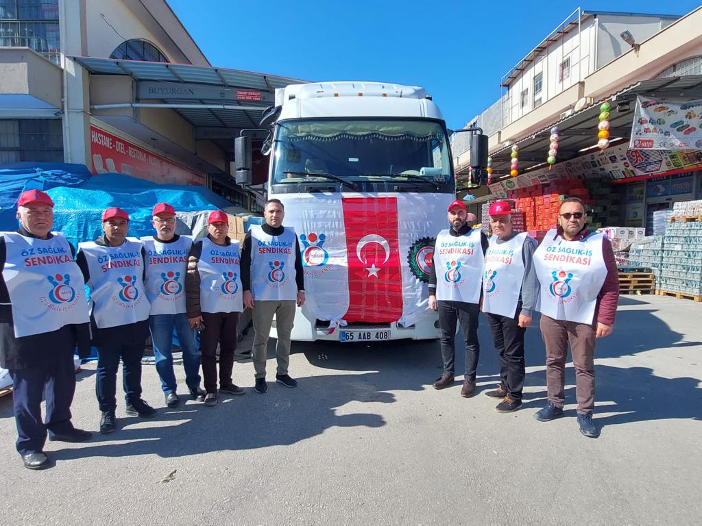 Öz Sağlık-İş yardım tırında başta ekmek, su, acil temel gıda ve hijyen malzemeleri bulunuyor.