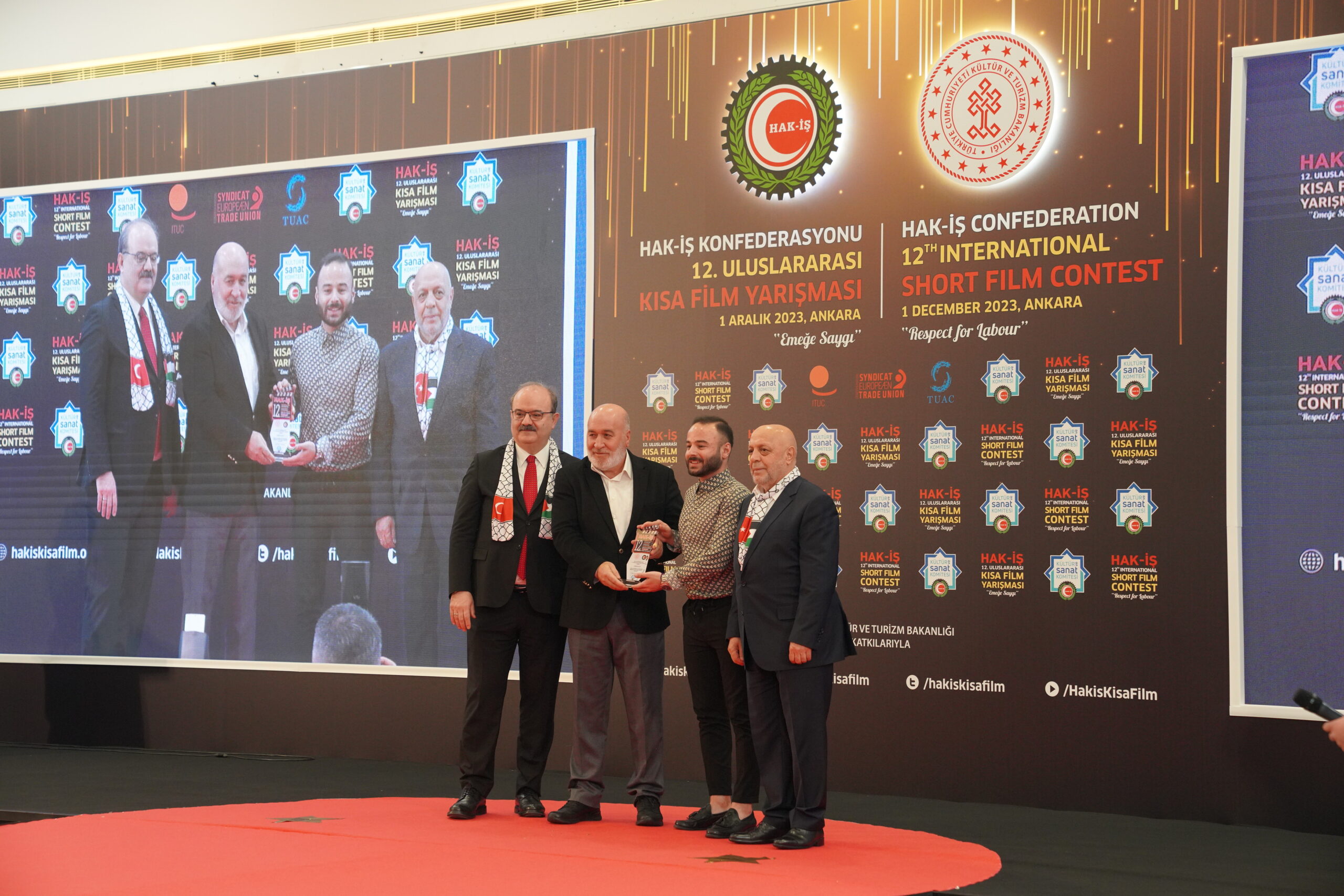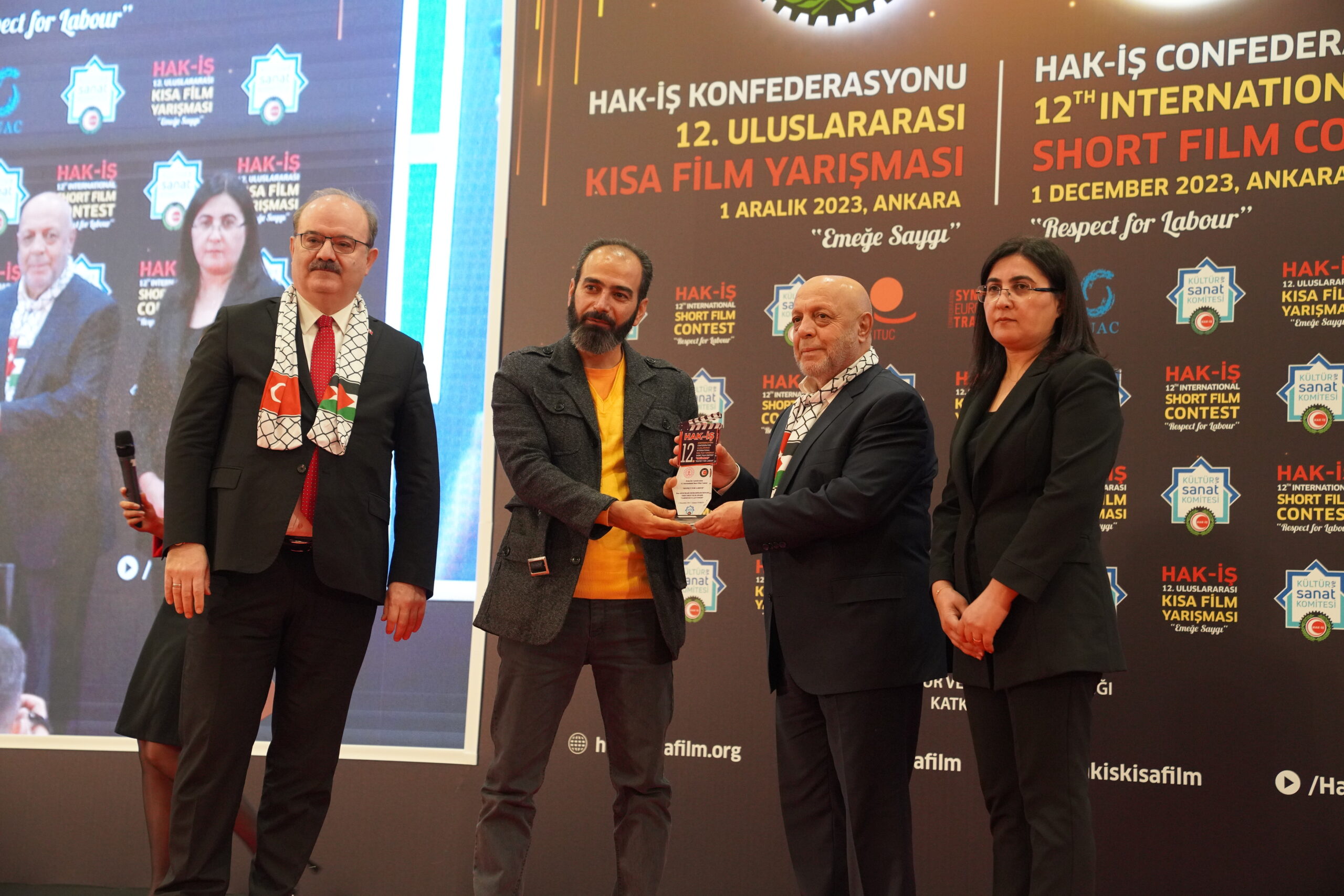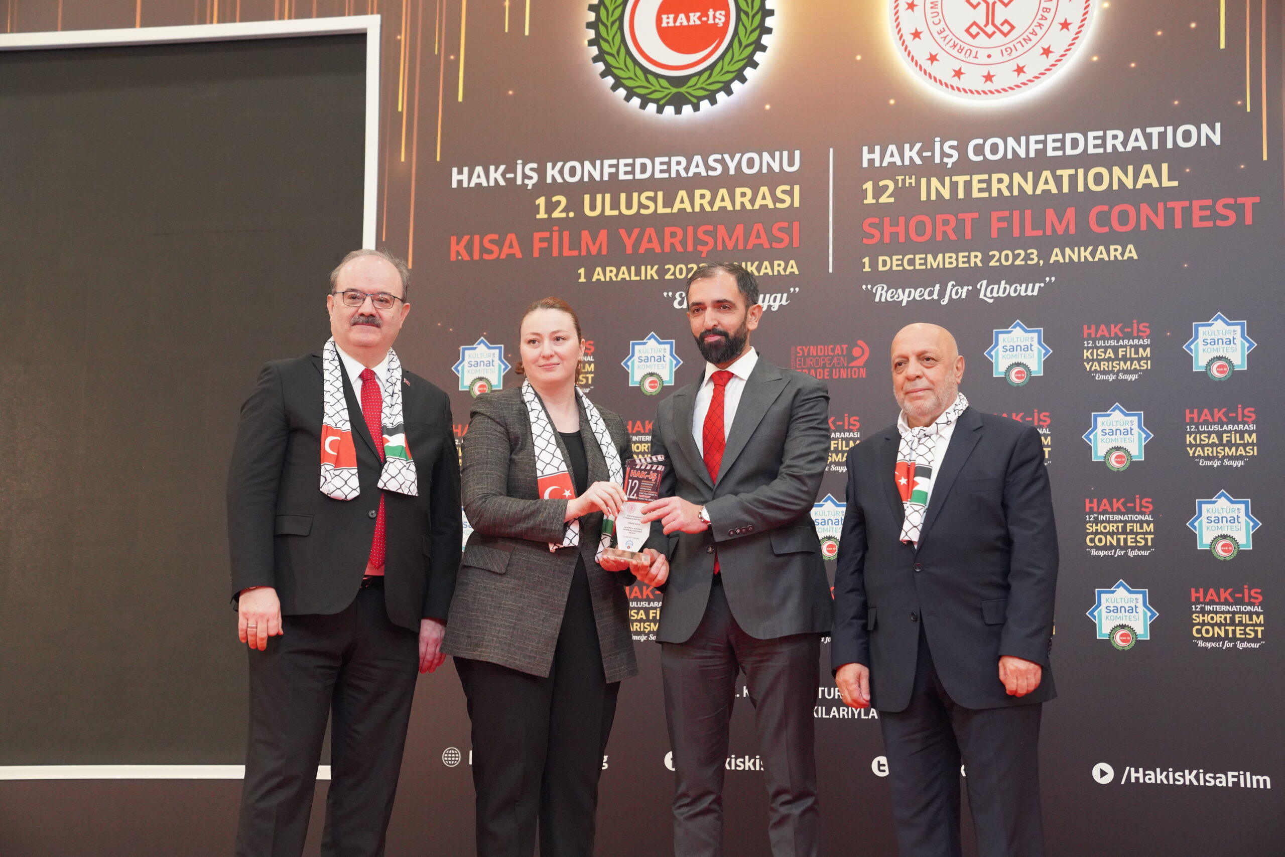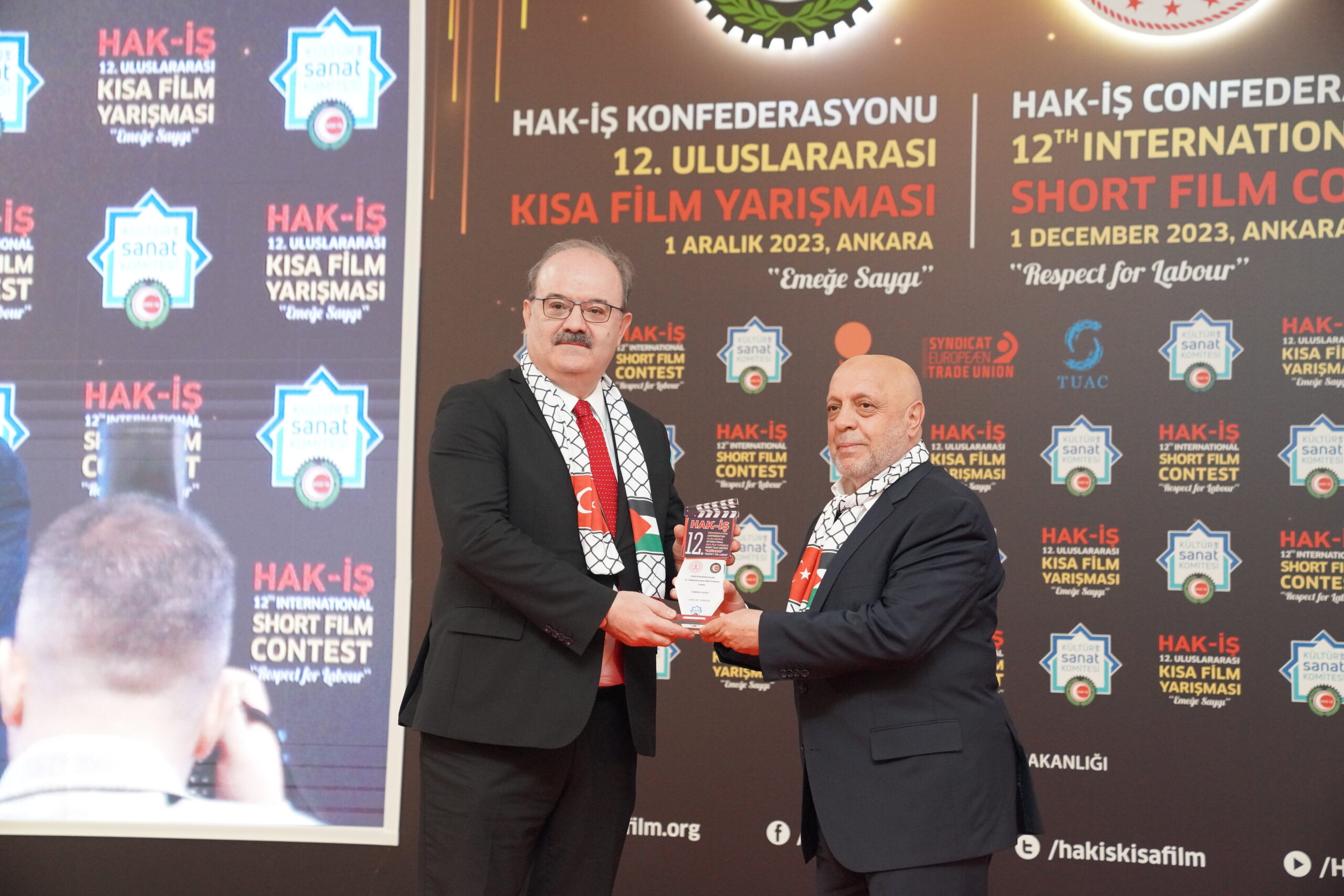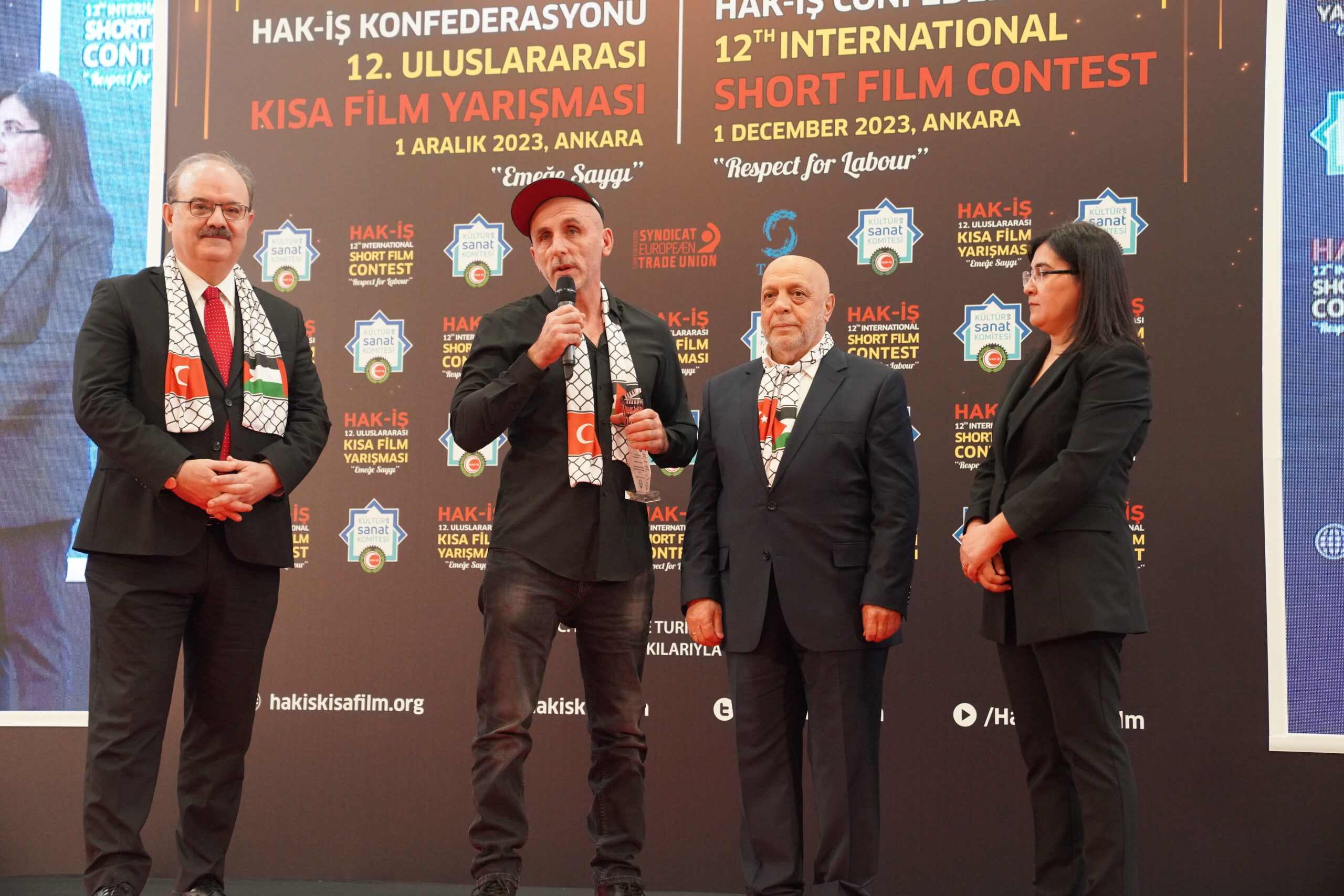 Konuşmaların ardından ‘Emeğe Saygı’ temalı HAK-İŞ 12. Uluslararası Kısa Film Yarışmasında ödüle layık görülen eser sahipleri ödülleriyle buluştu. Bu yıl 128 farklı ülkeden 4 bin 431 filmin başvuru yaptığı yarışmada ulusal ve uluslararası alanda 11 kategoride ve ayrıca Sendikacı Gözünden kategorisinde ödüller sahiplerini buldu.