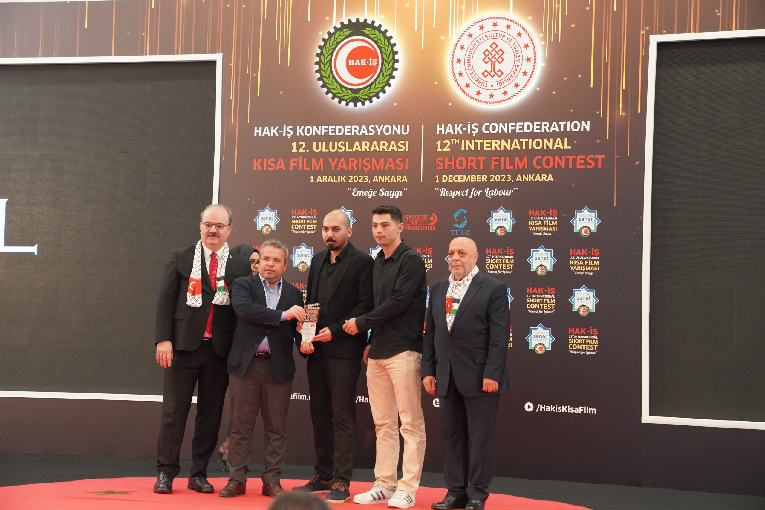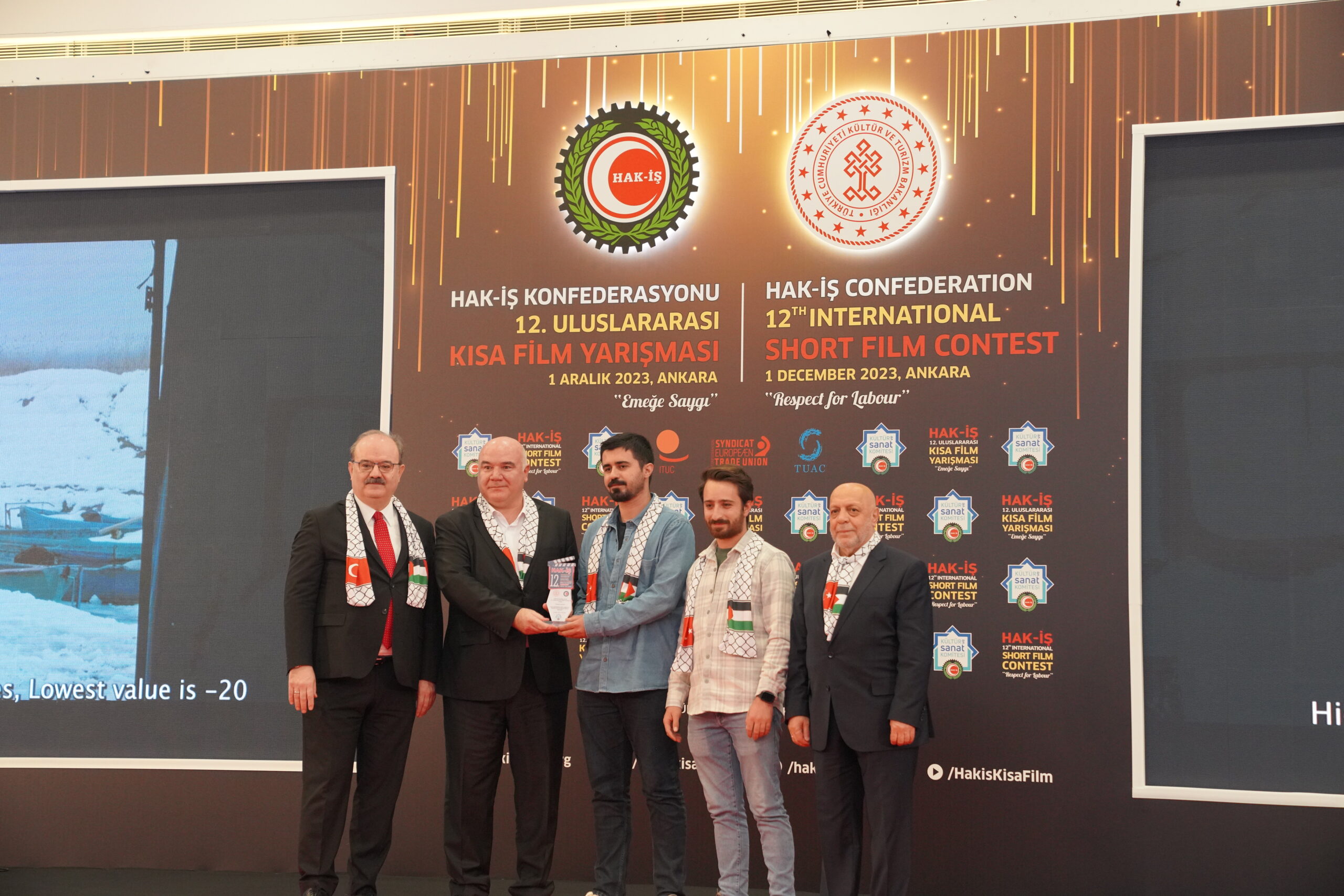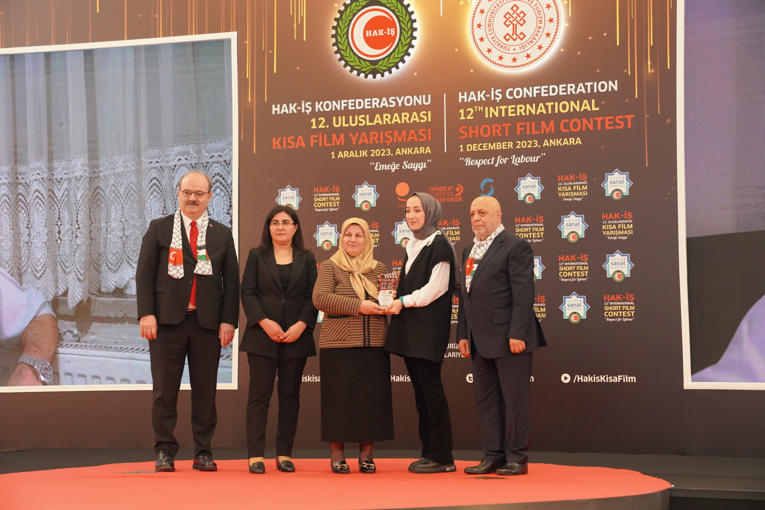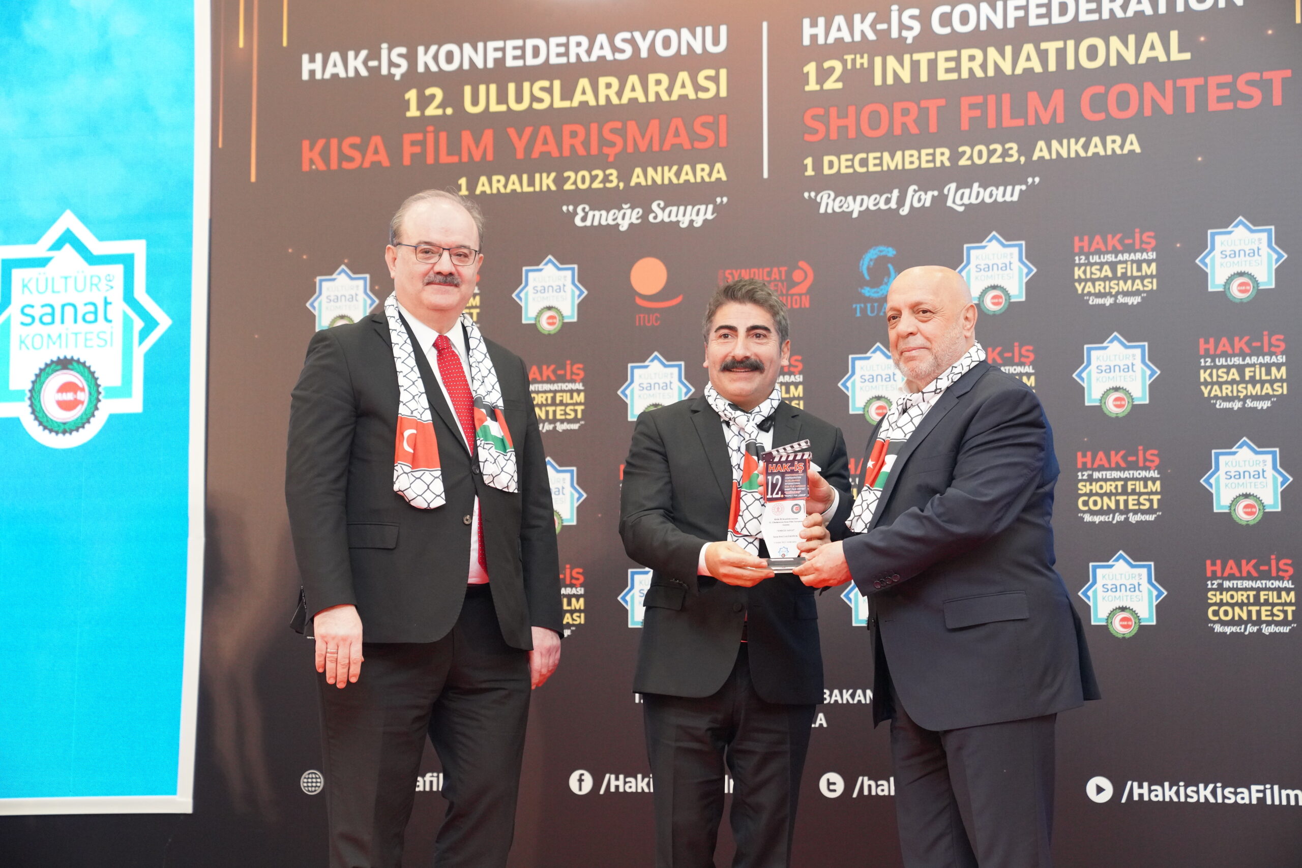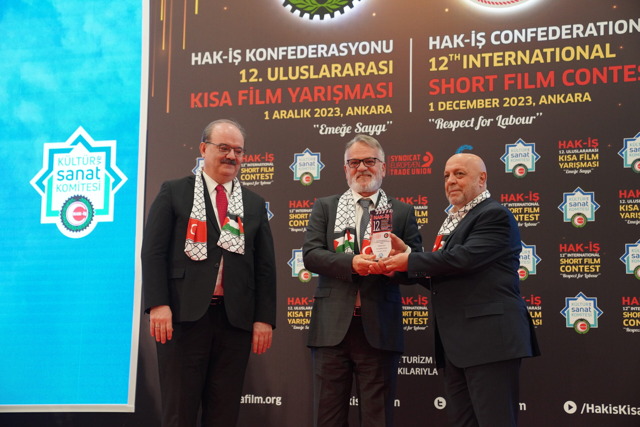 Konuşmaların ardından ‘Emeğe Saygı’ temalı HAK-İŞ 12. Uluslararası Kısa Film Yarışmasında ödüle layık görülen eser sahipleri ödülleriyle buluştu. Bu yıl 128 farklı ülkeden 4 bin 431 filmin başvuru yaptığı yarışmada ulusal ve uluslararası alanda 11 kategoride ve ayrıca Sendikacı Gözünden kategorisinde ödüller sahiplerini buldu.