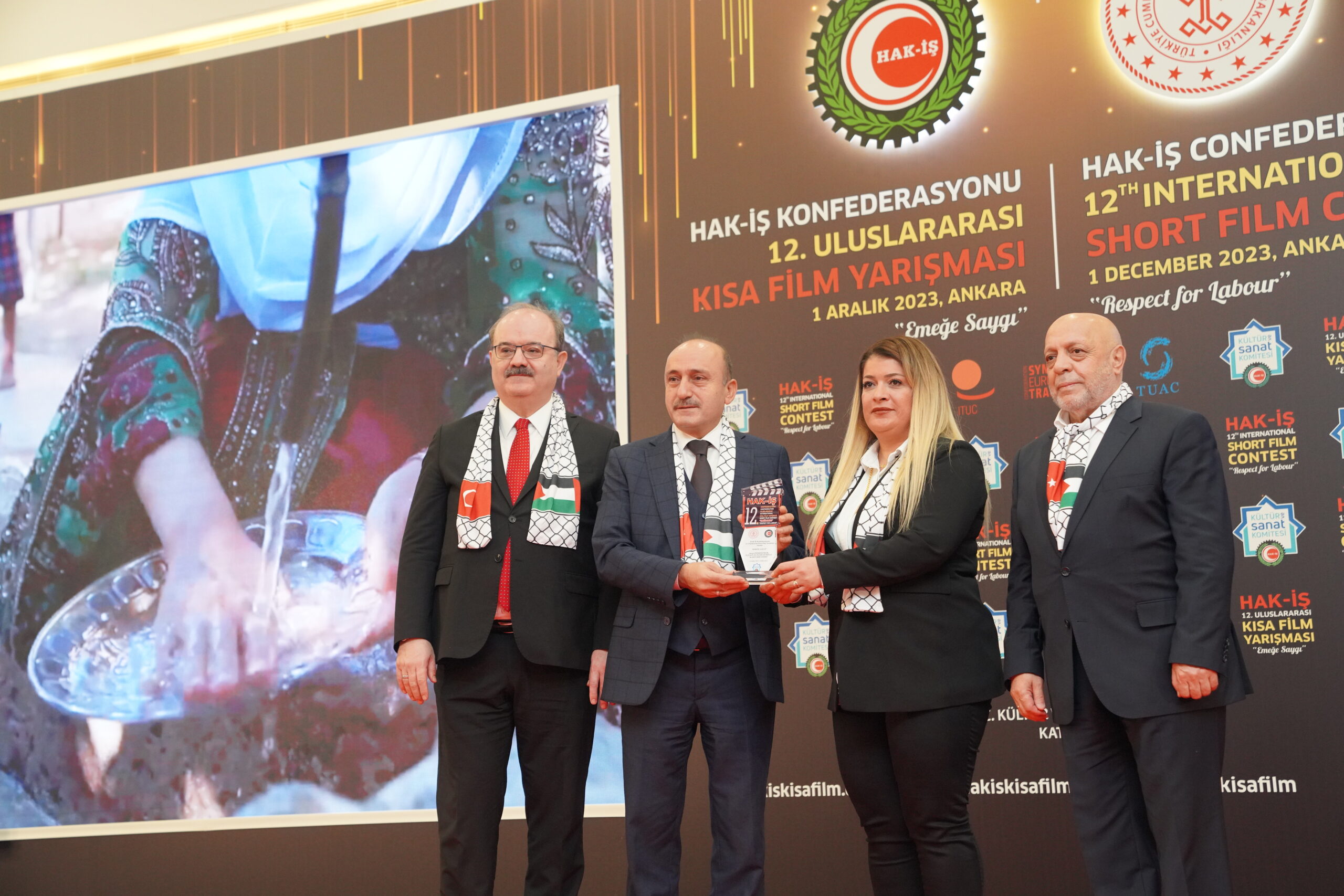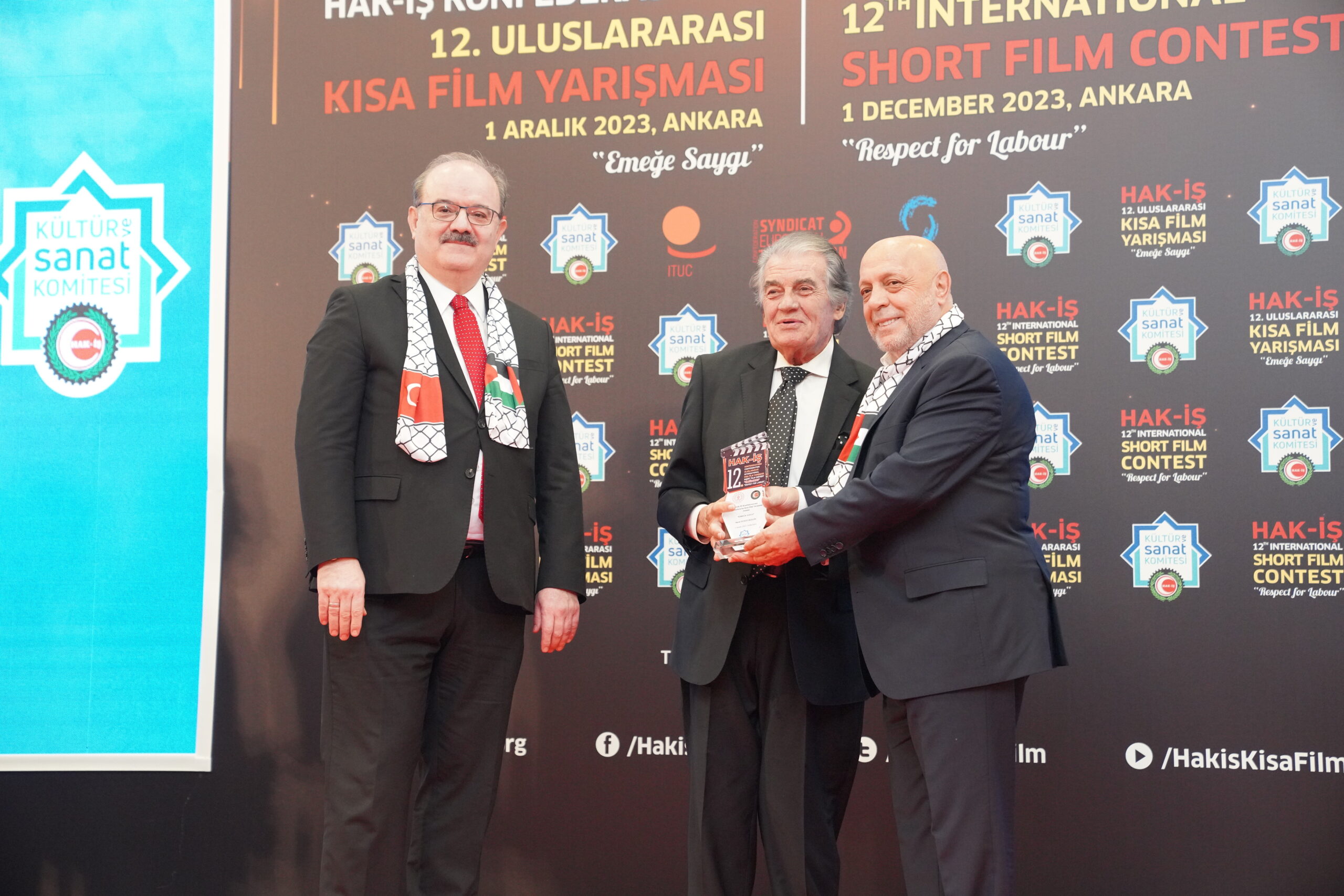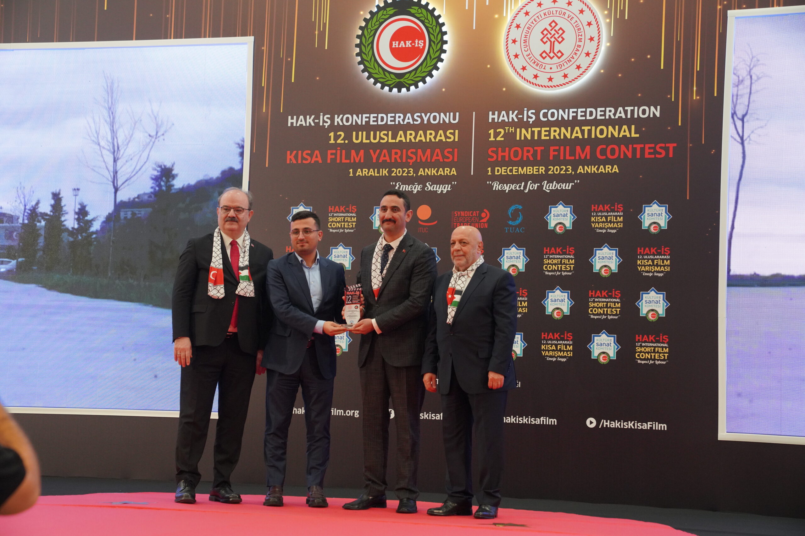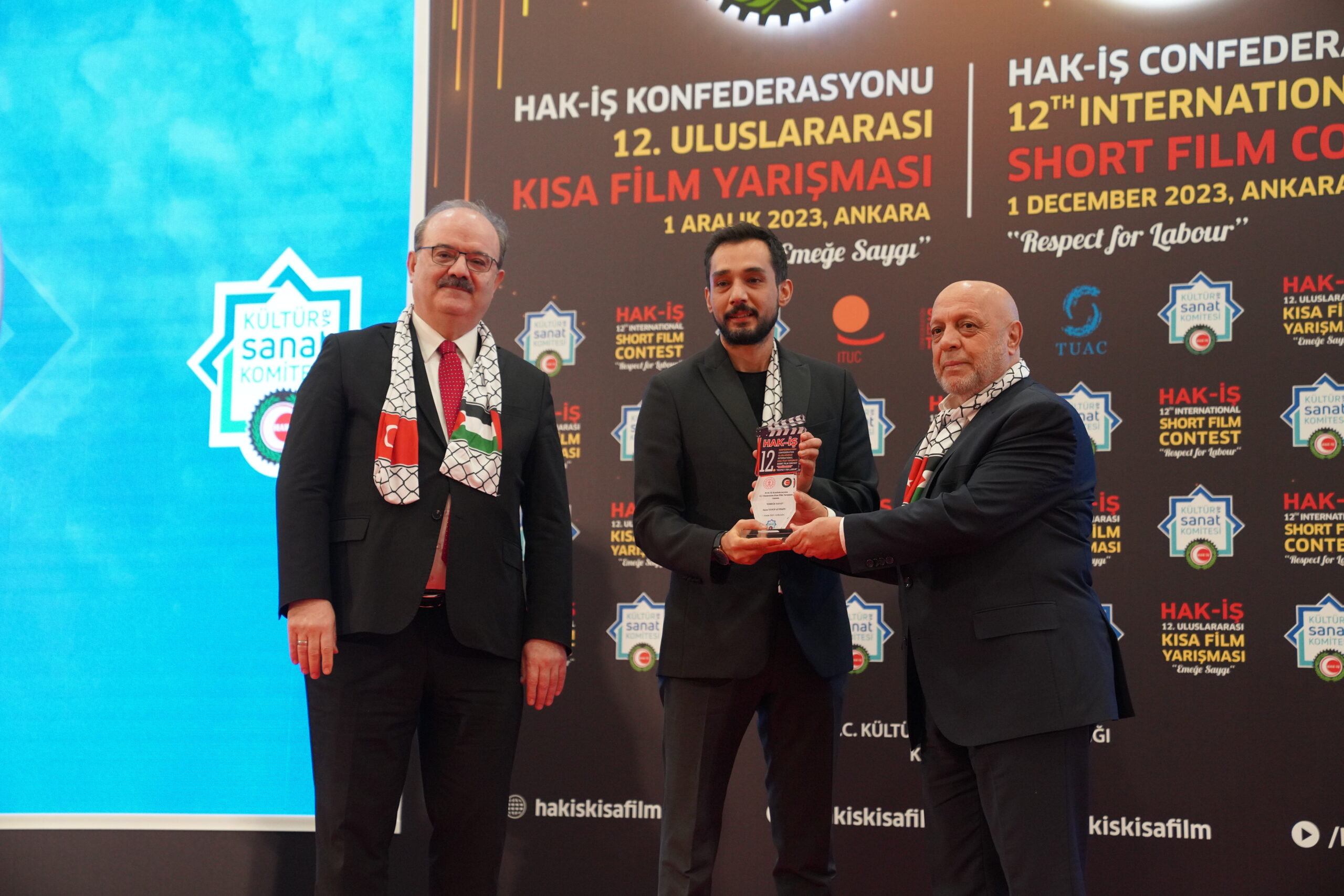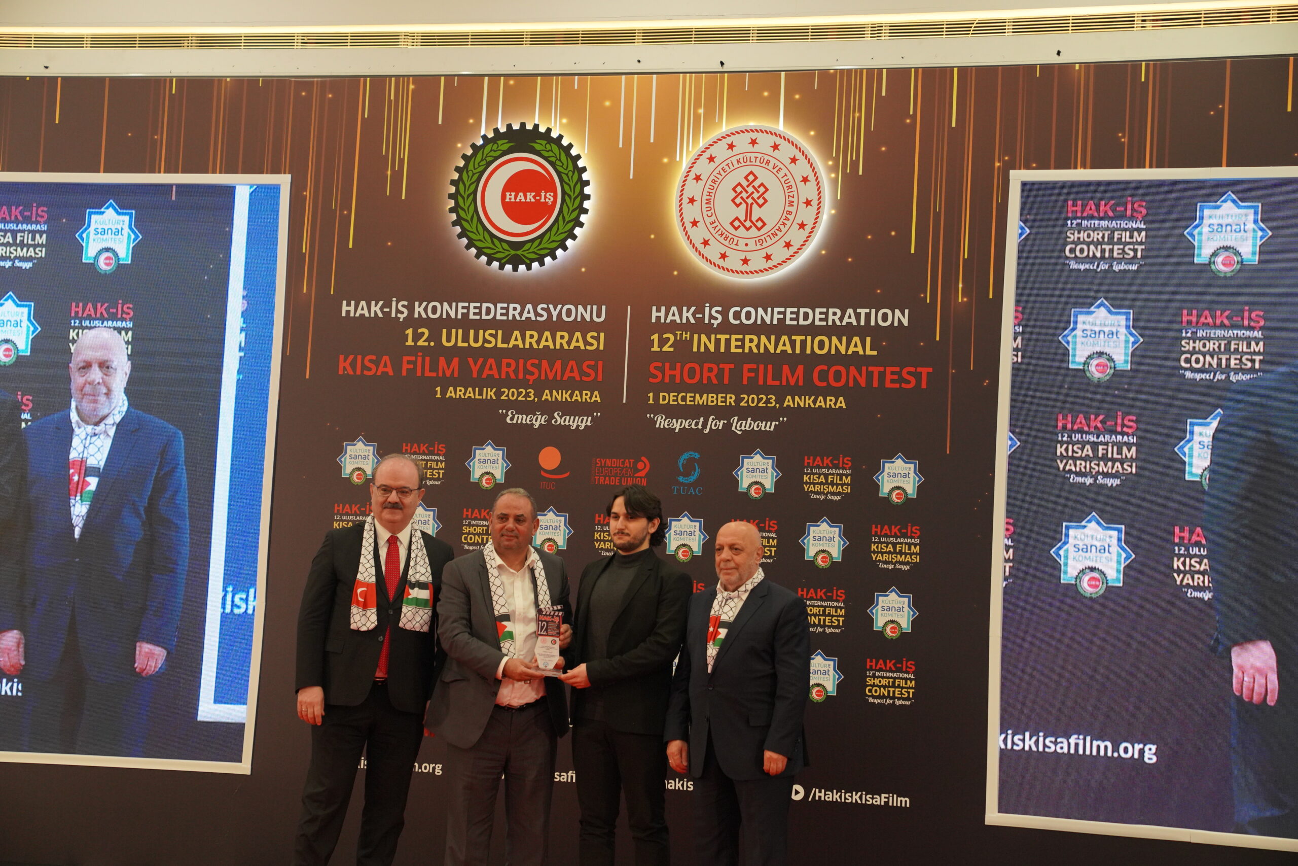 Konuşmaların ardından ‘Emeğe Saygı’ temalı HAK-İŞ 12. Uluslararası Kısa Film Yarışmasında ödüle layık görülen eser sahipleri ödülleriyle buluştu. Bu yıl 128 farklı ülkeden 4 bin 431 filmin başvuru yaptığı yarışmada ulusal ve uluslararası alanda 11 kategoride ve ayrıca Sendikacı Gözünden kategorisinde ödüller sahiplerini buldu.