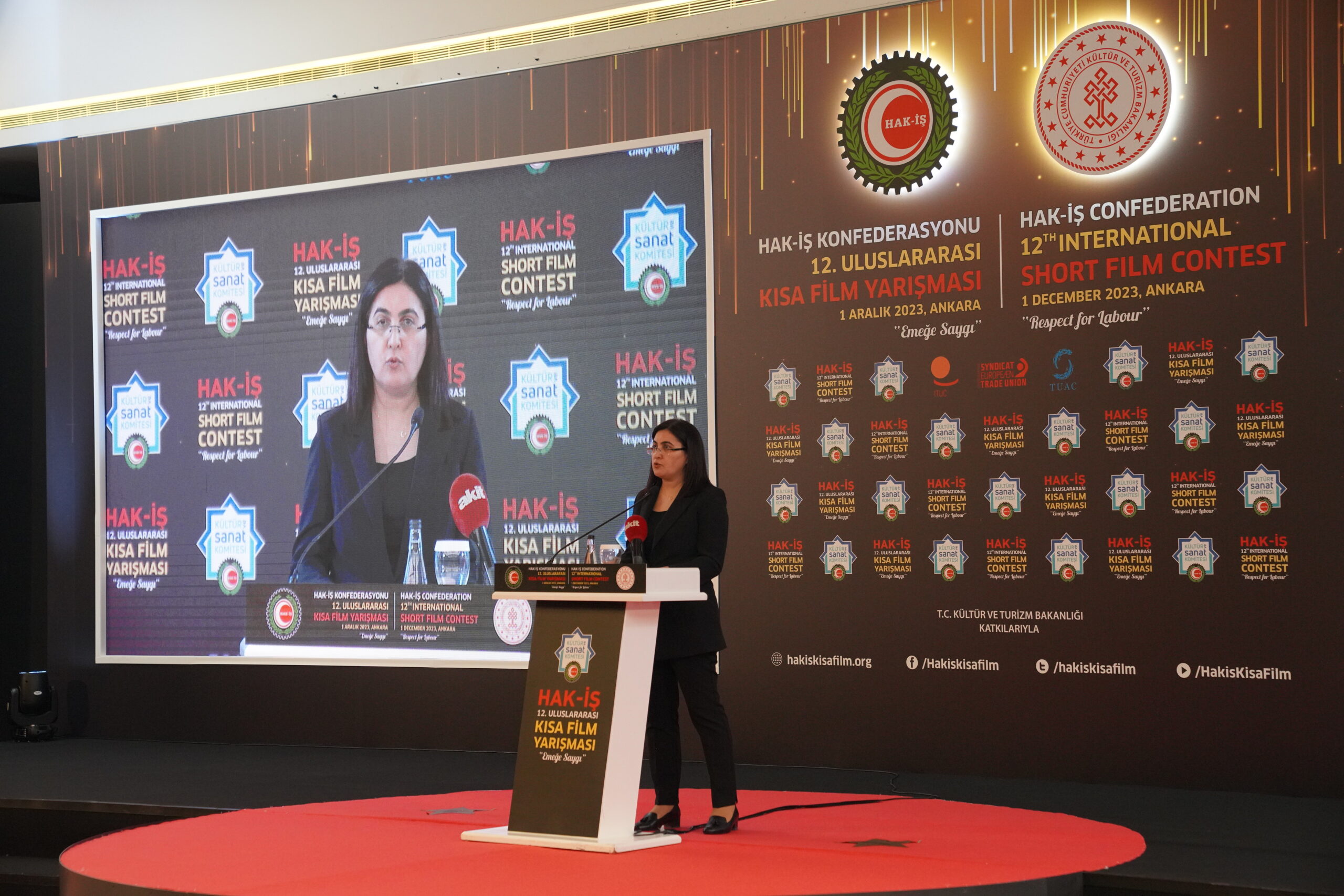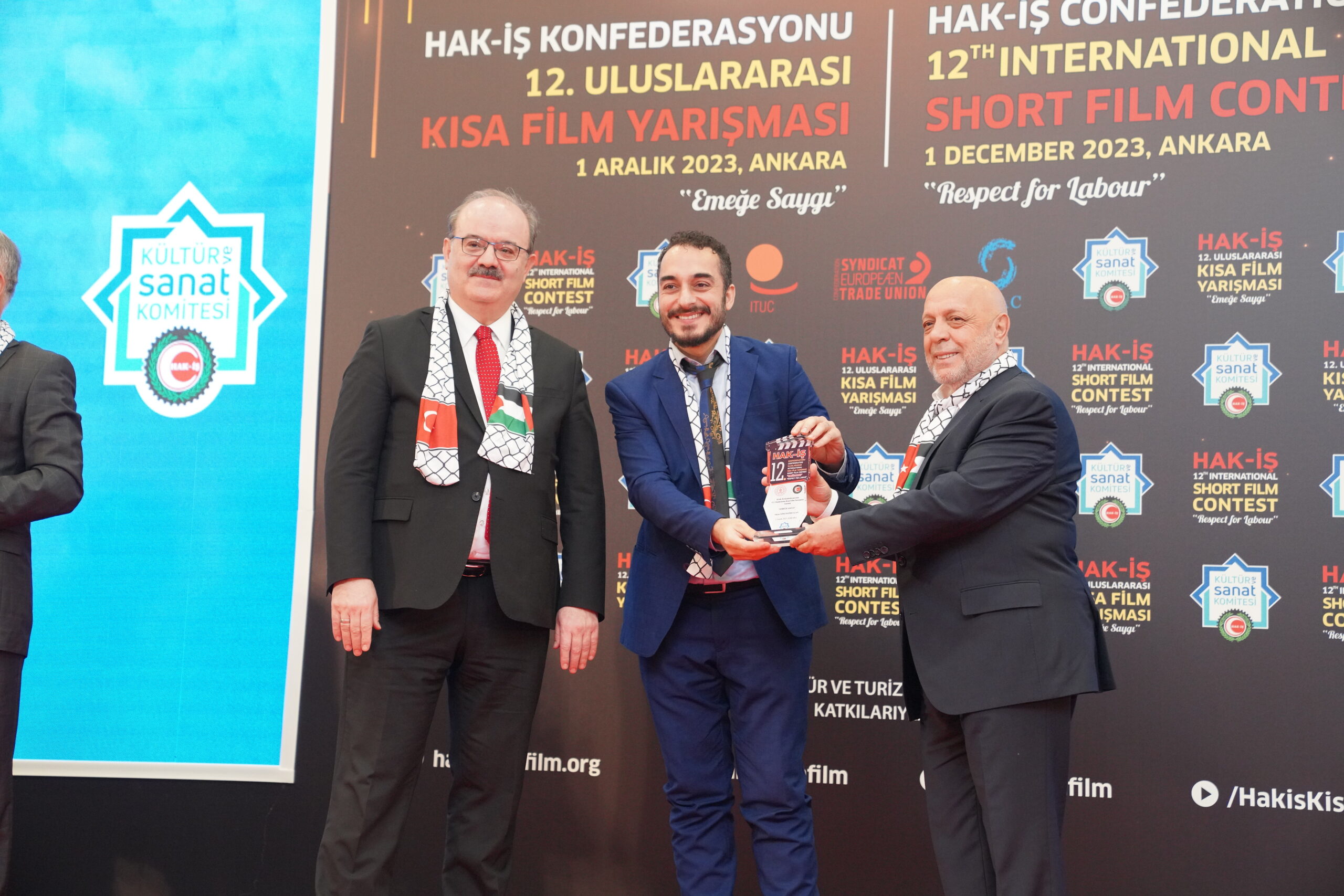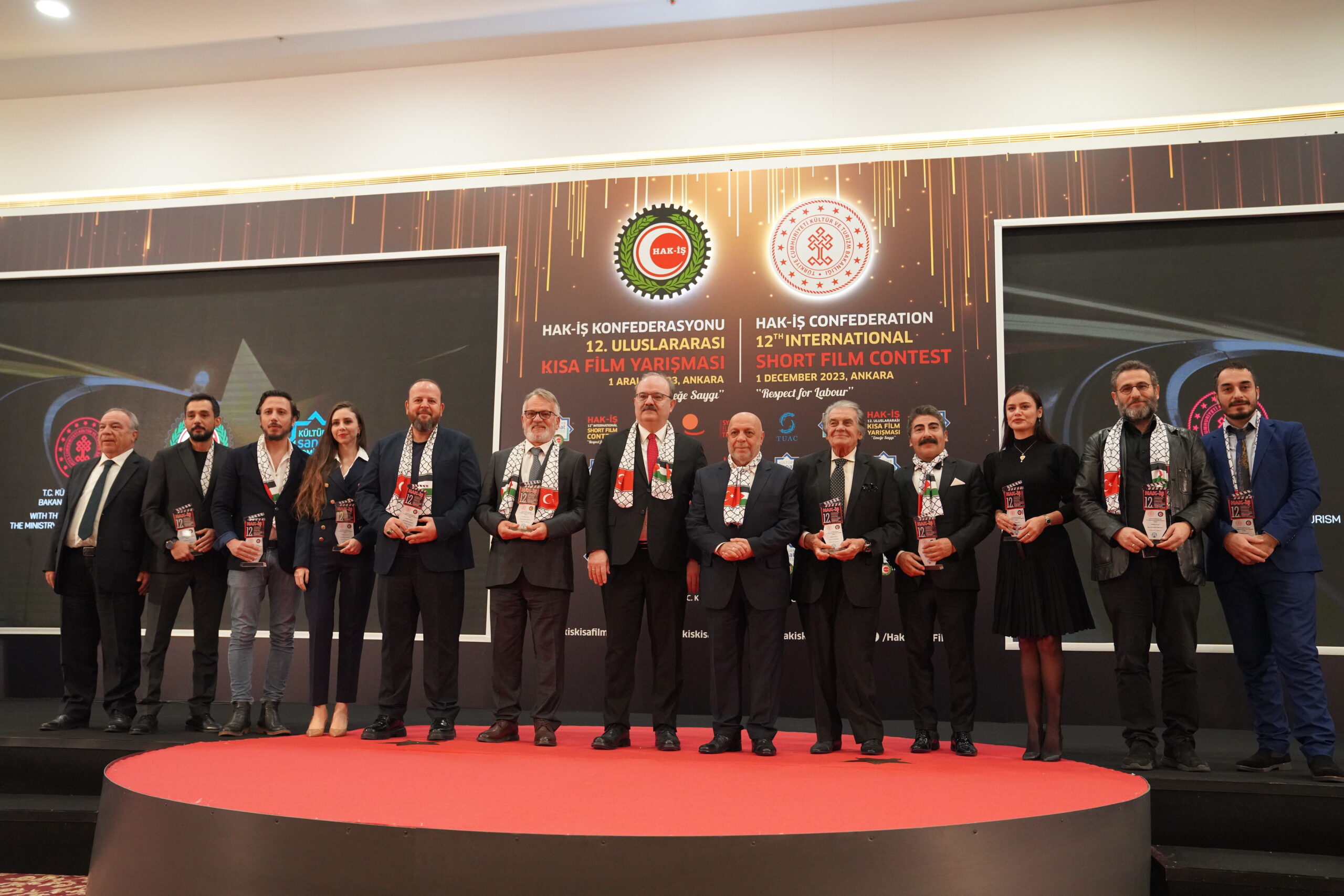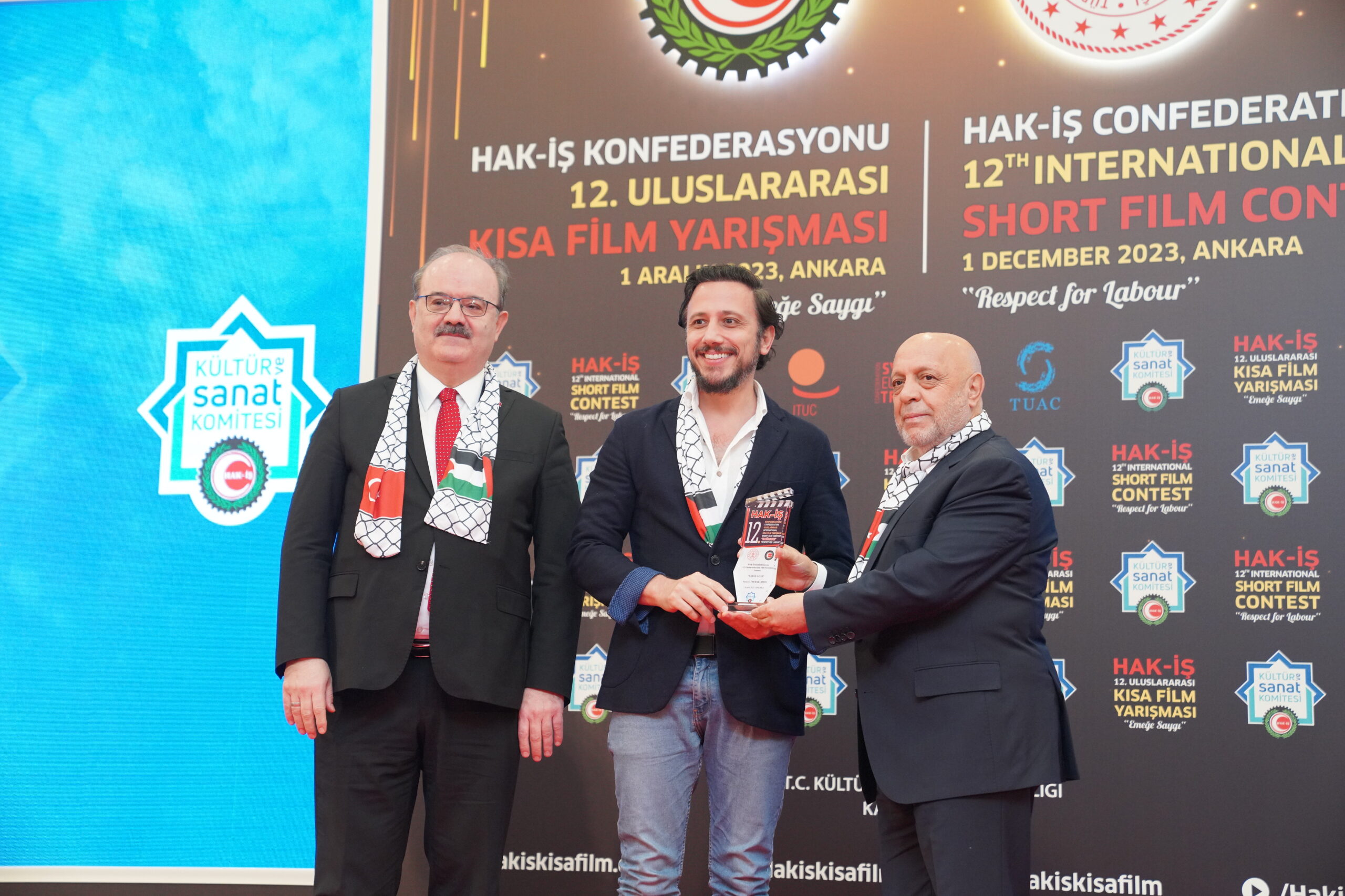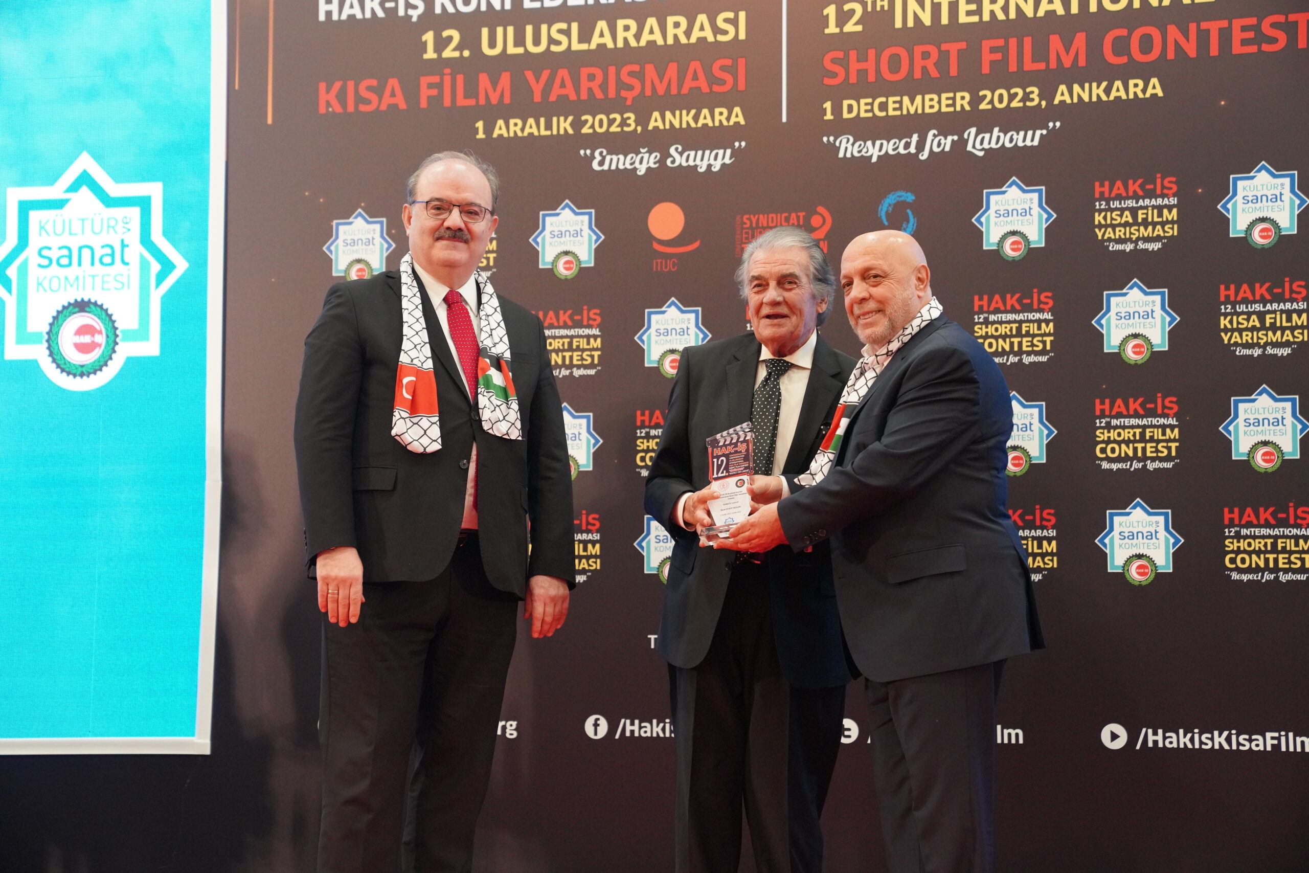 Konuşmaların ardından ‘Emeğe Saygı’ temalı HAK-İŞ 12. Uluslararası Kısa Film Yarışmasında ödüle layık görülen eser sahipleri ödülleriyle buluştu. Bu yıl 128 farklı ülkeden 4 bin 431 filmin başvuru yaptığı yarışmada ulusal ve uluslararası alanda 11 kategoride ve ayrıca Sendikacı Gözünden kategorisinde ödüller sahiplerini buldu.