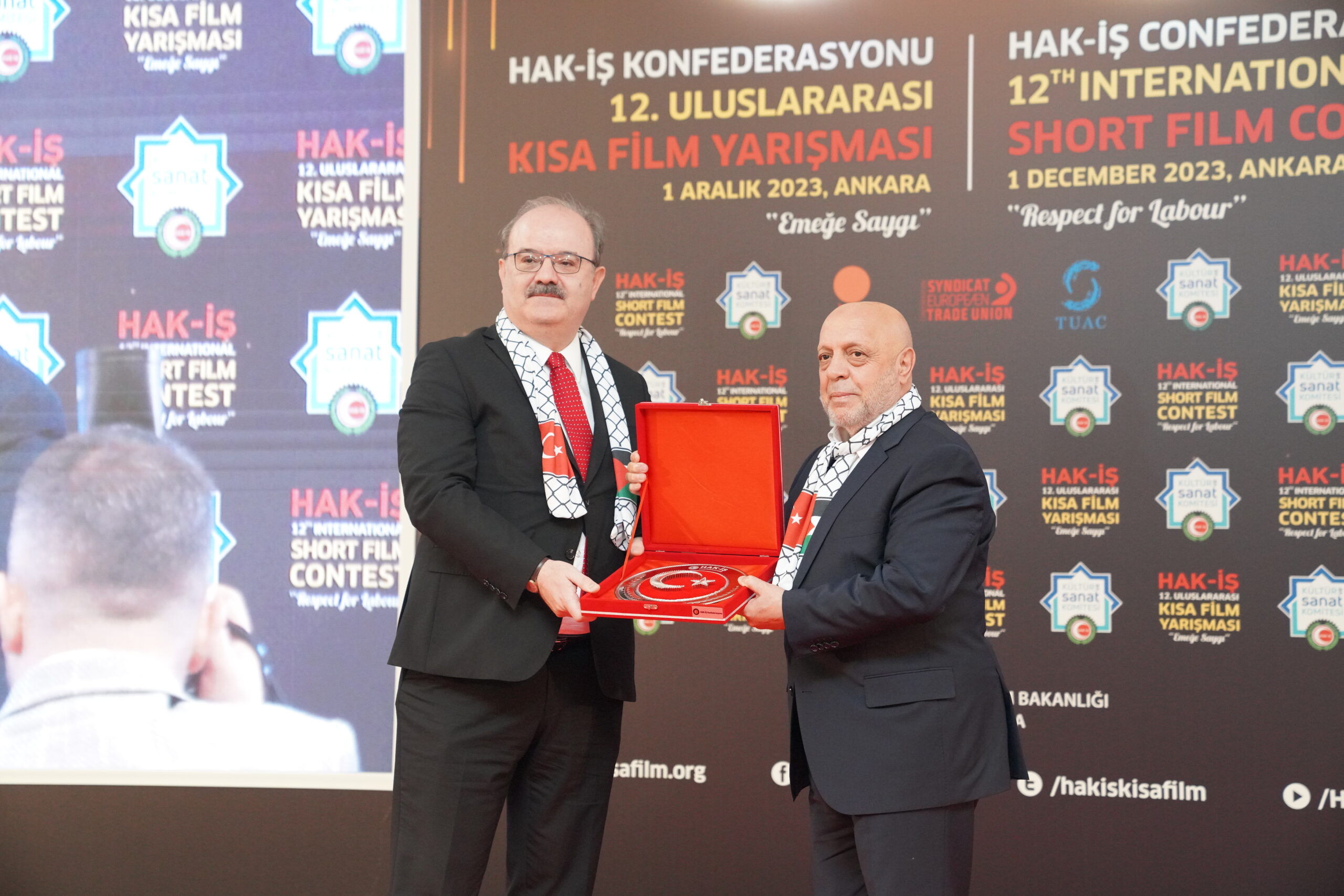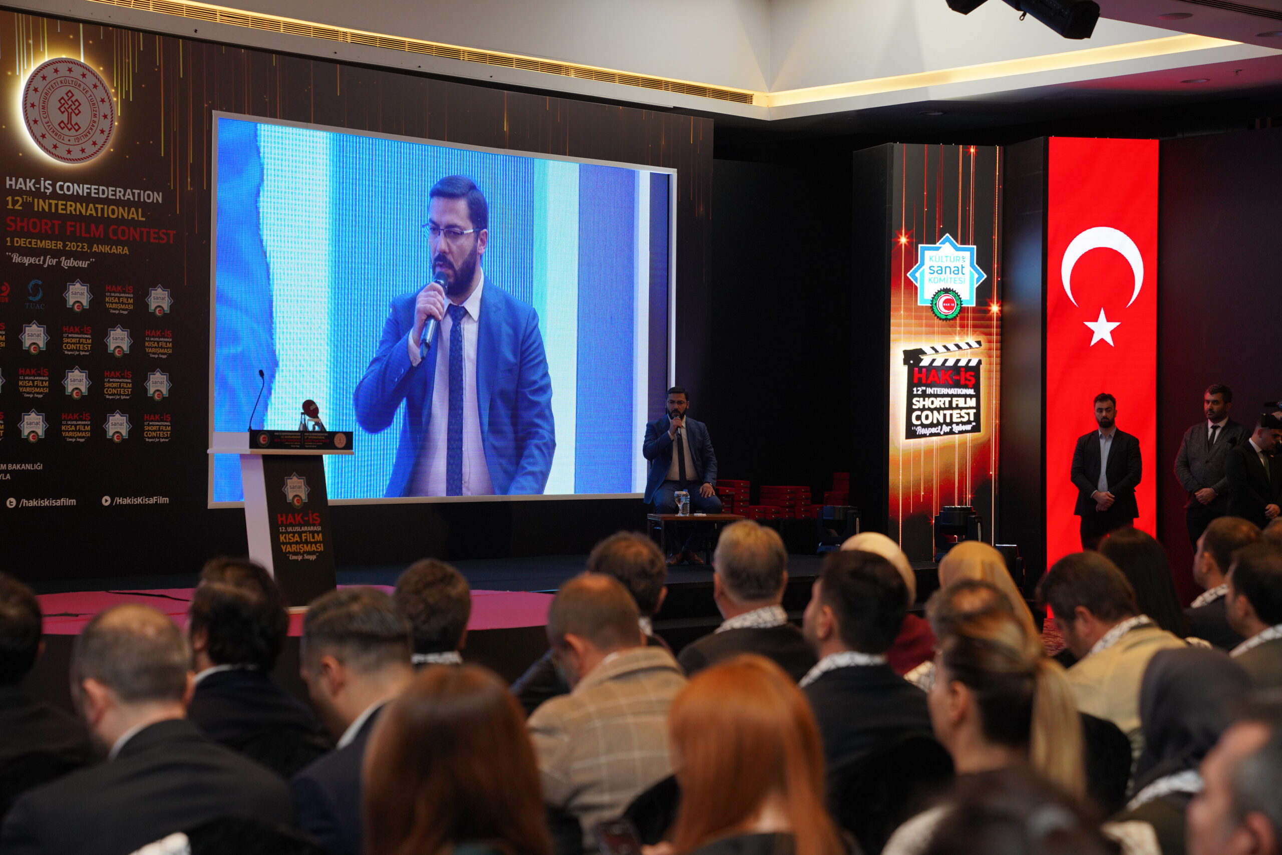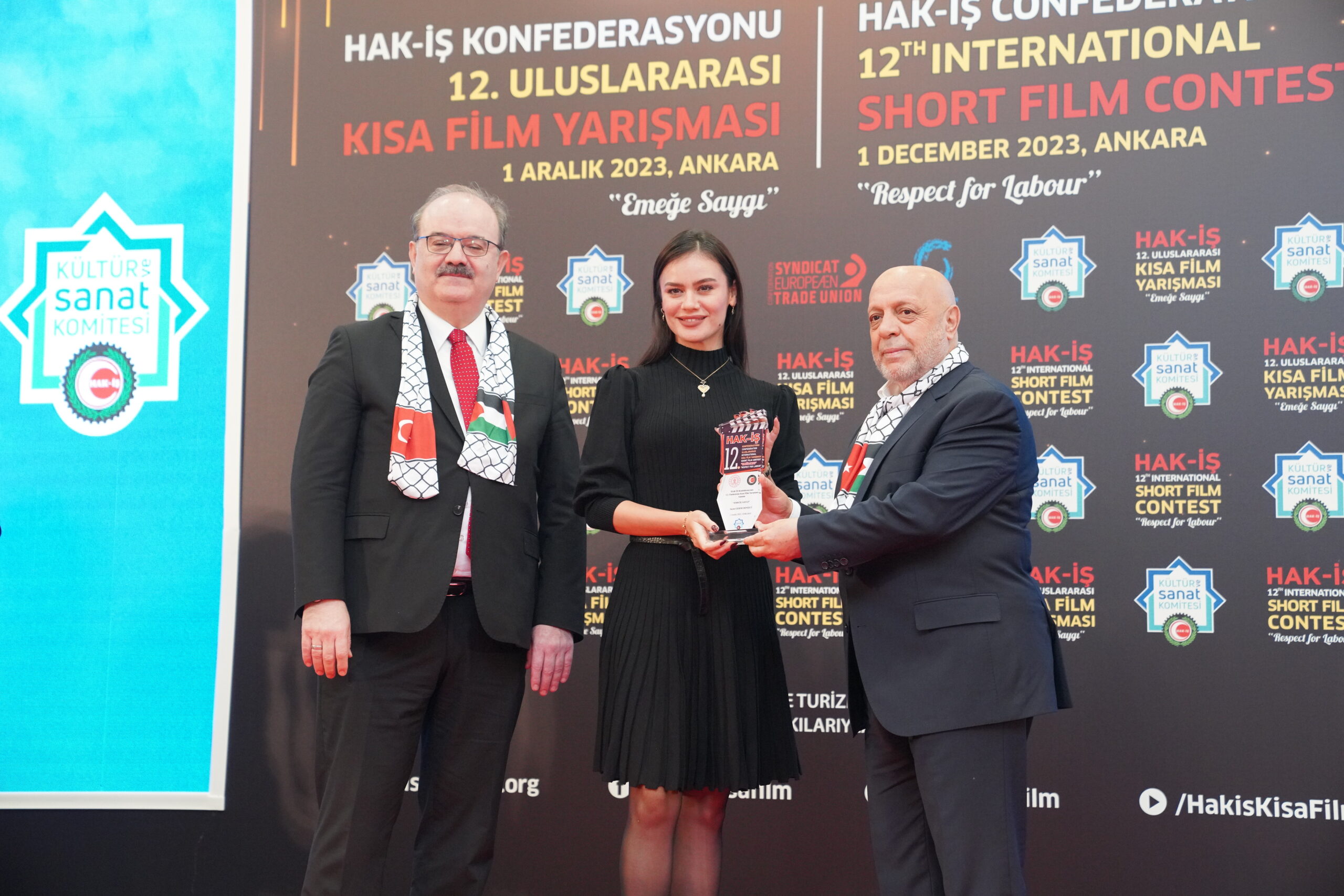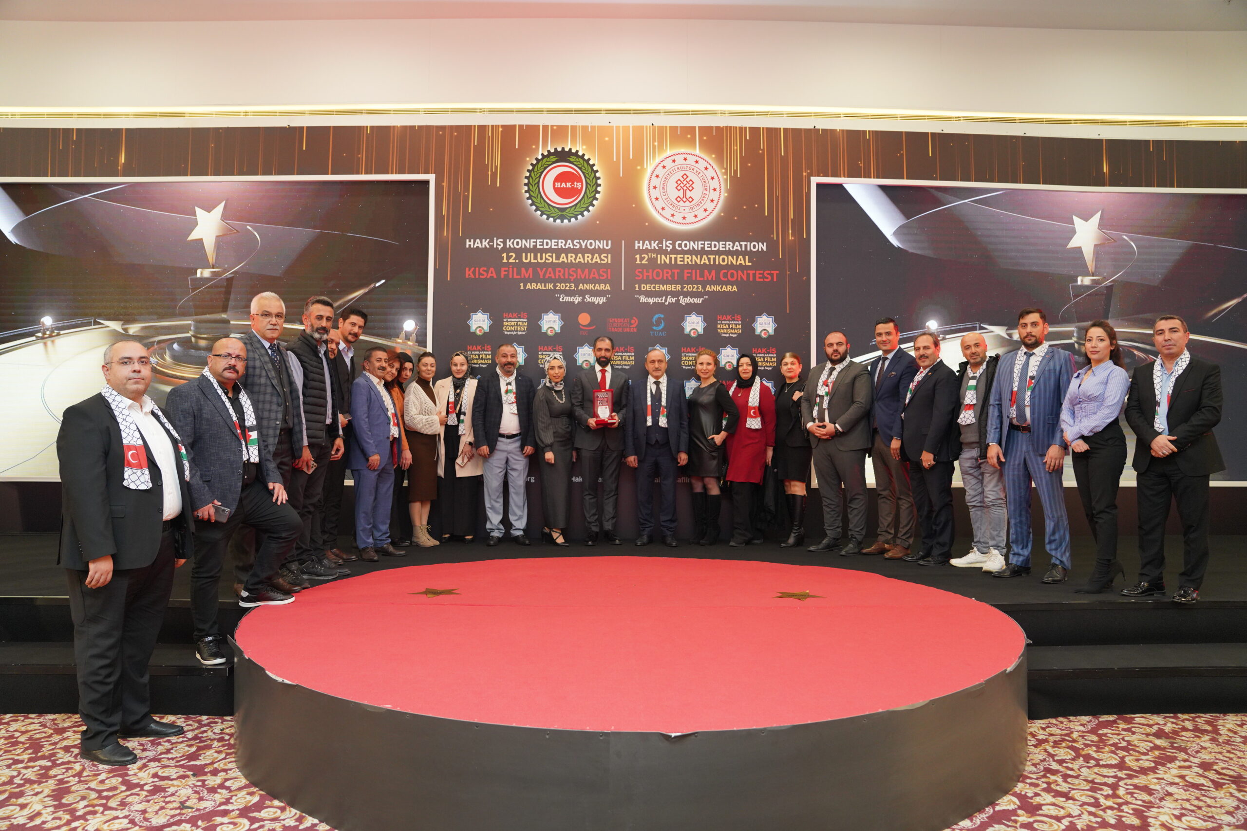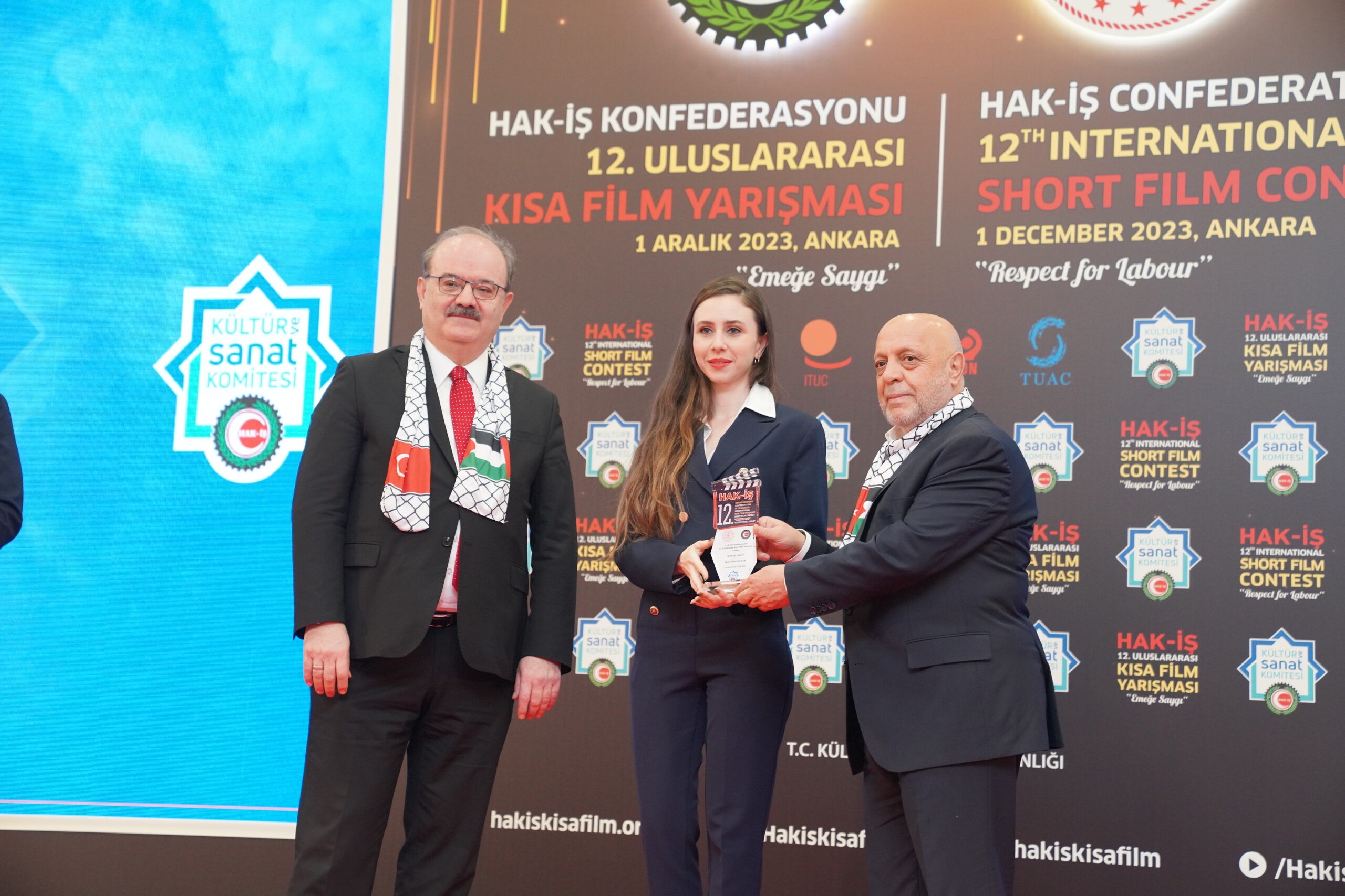 Konuşmaların ardından ‘Emeğe Saygı’ temalı HAK-İŞ 12. Uluslararası Kısa Film Yarışmasında ödüle layık görülen eser sahipleri ödülleriyle buluştu. Bu yıl 128 farklı ülkeden 4 bin 431 filmin başvuru yaptığı yarışmada ulusal ve uluslararası alanda 11 kategoride ve ayrıca Sendikacı Gözünden kategorisinde ödüller sahiplerini buldu.