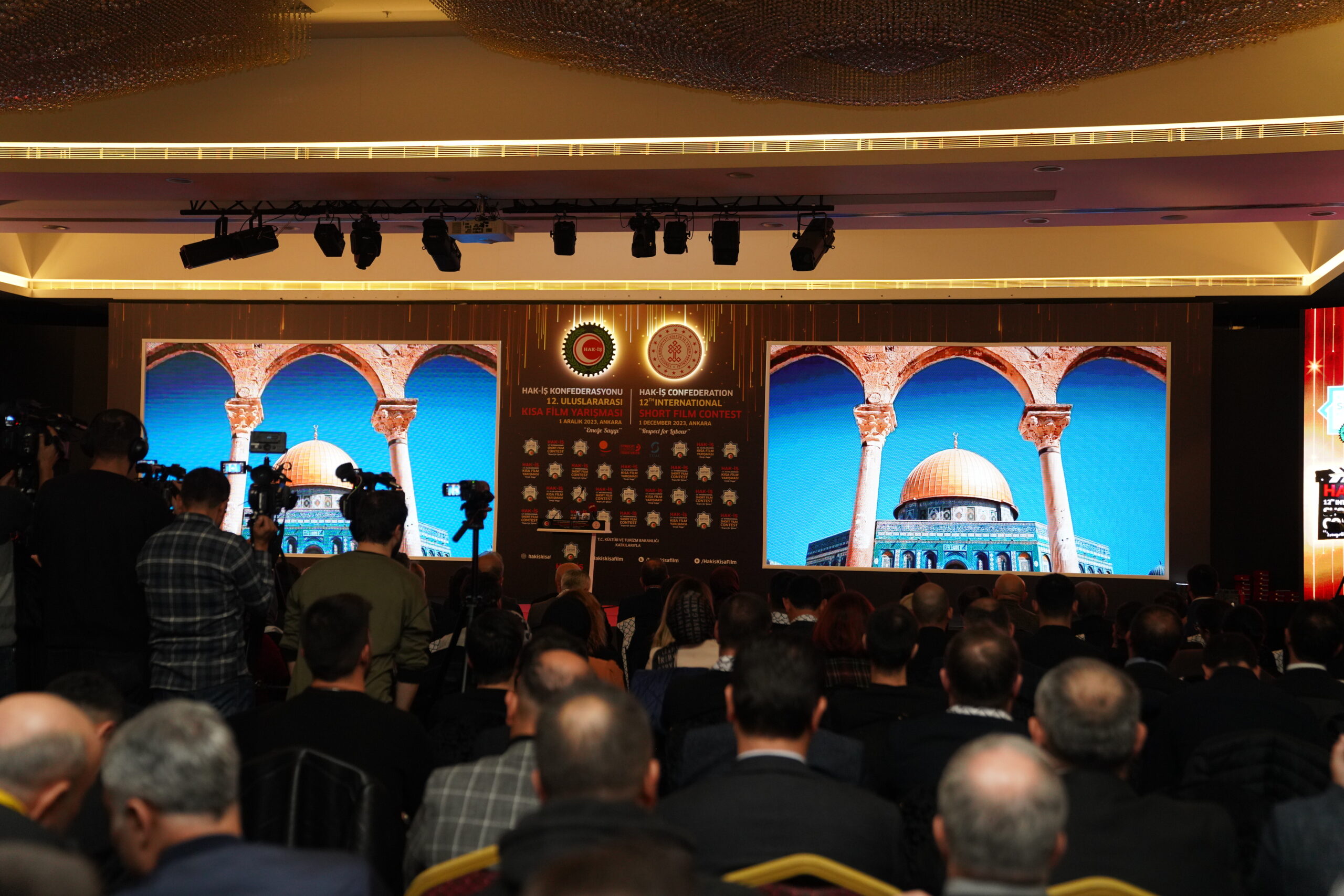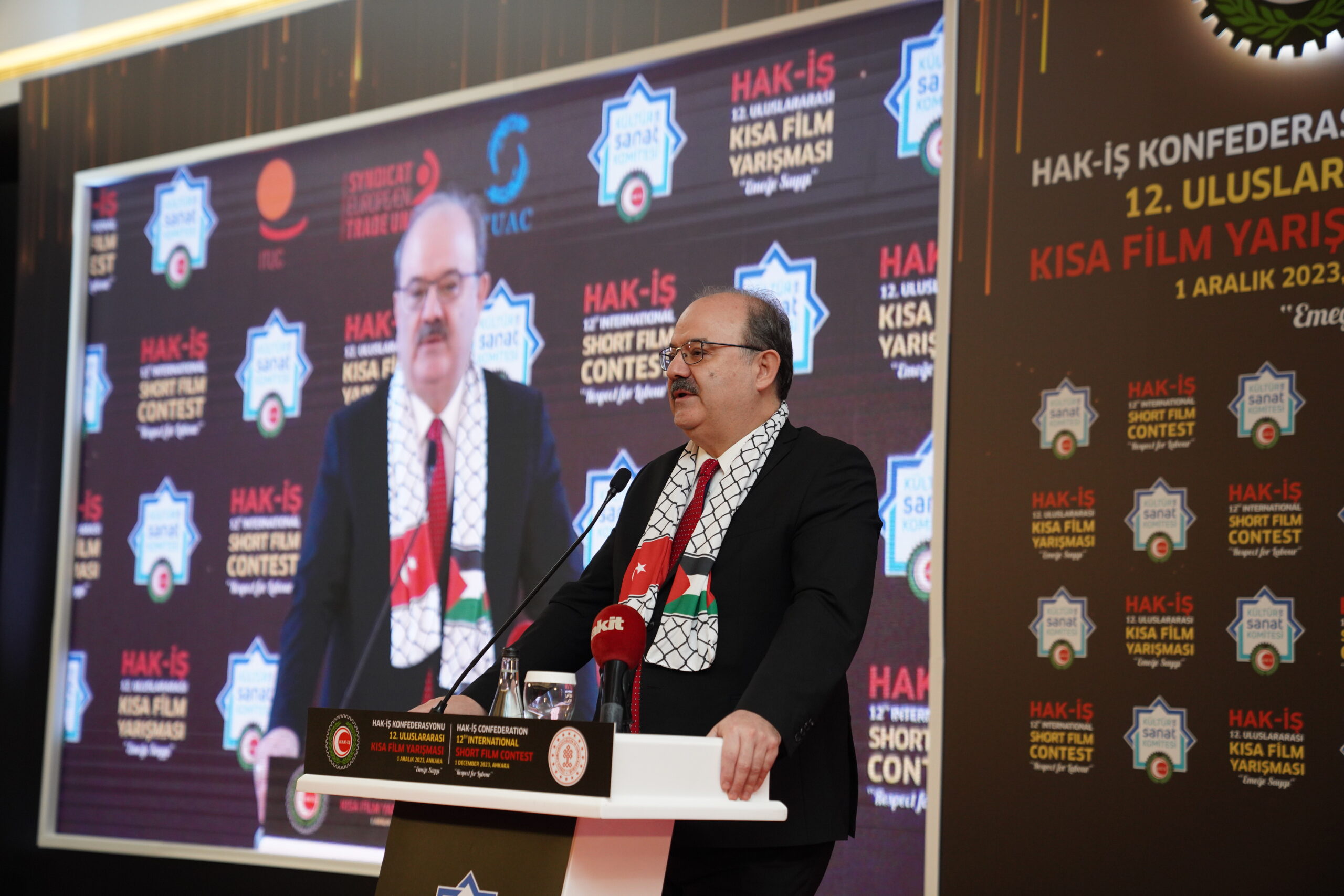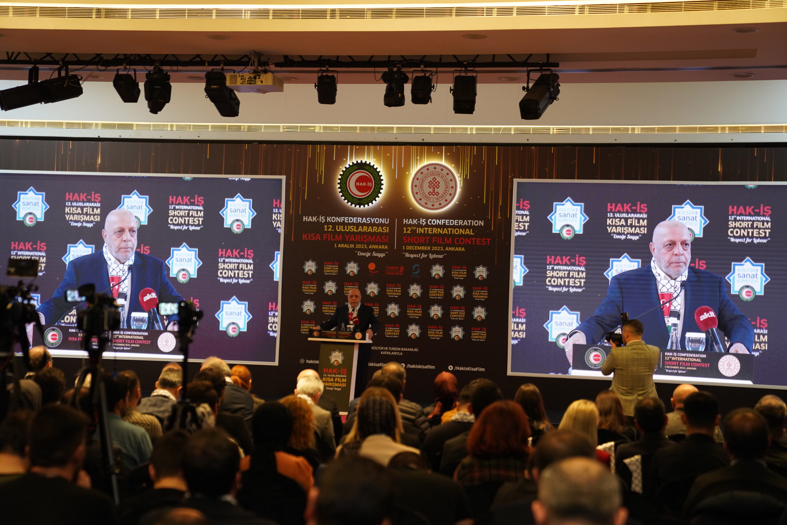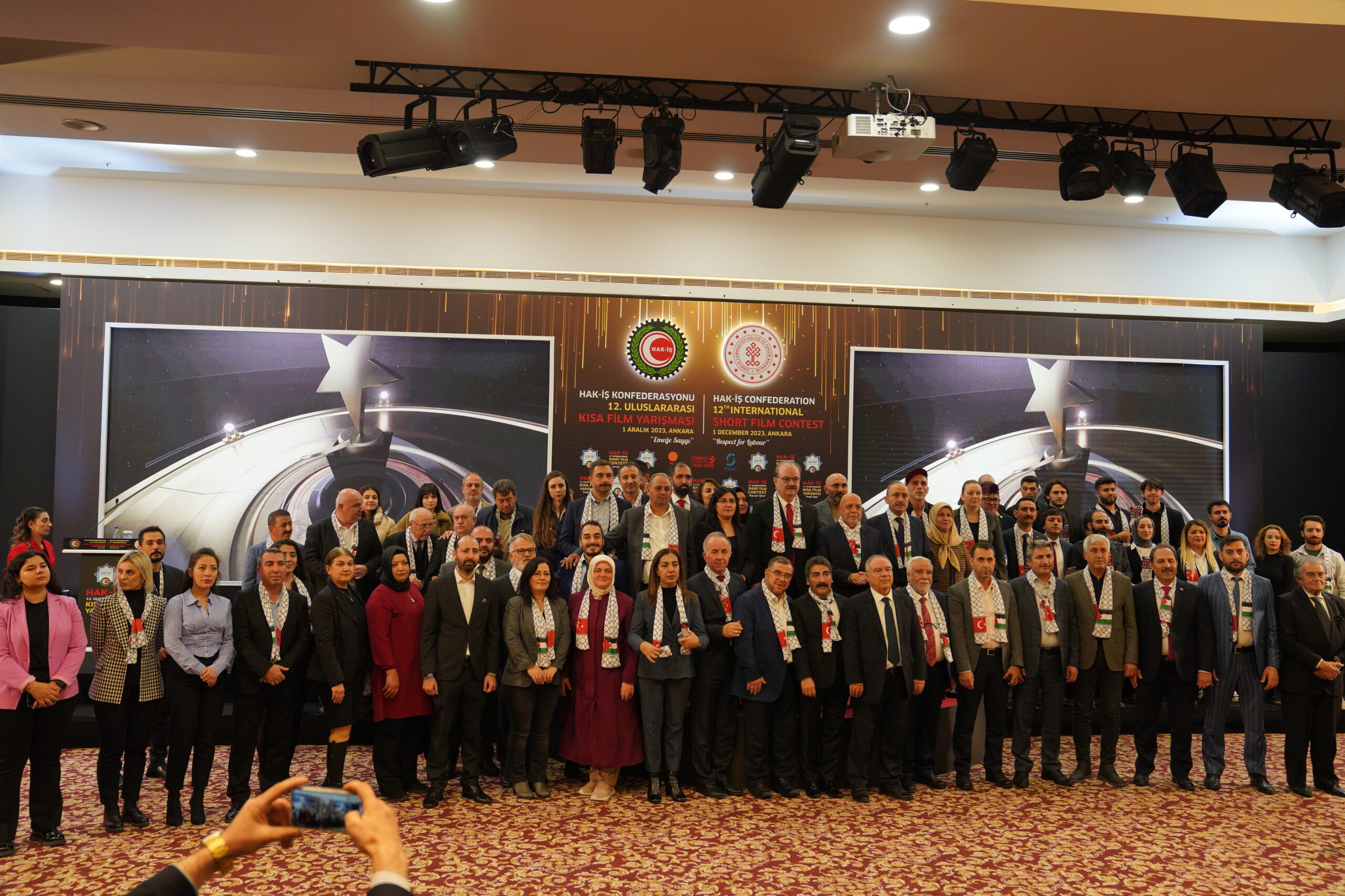Konfederasyonumuz Genel Başkanı Mahmut Arslan, HAK-İŞ Kültür ve Sanat Komitesi’nin her yıl yeni başarılara imza atarak bu yıl 12. Gerçekleştirilen Kısa Film Yarışmasının Filistin’de yaşanan katliamların gölgesi altında buruk olarak kutlanıldığına dikkat çekti.