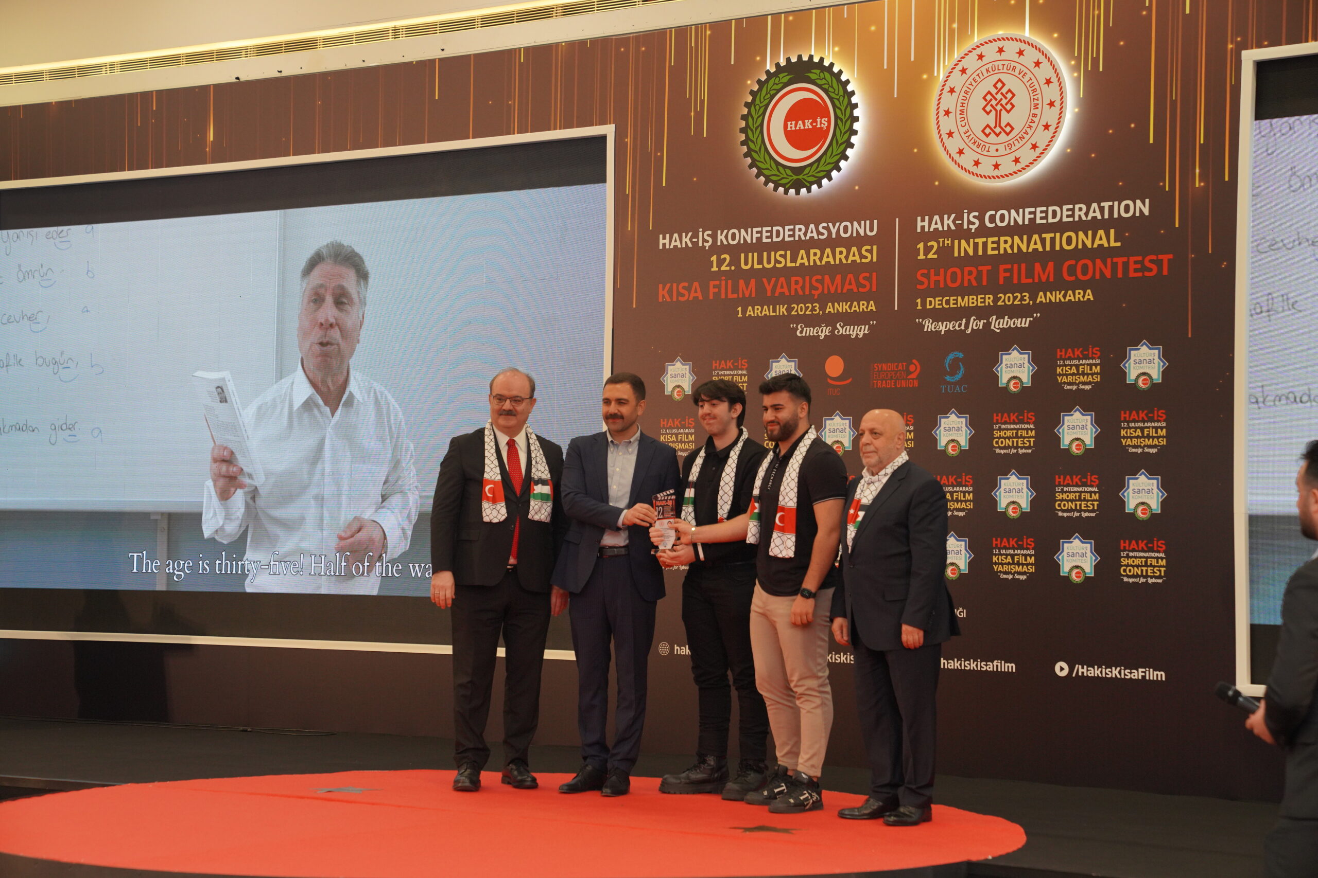 “Emeğe Saygı” temalı Uluslararası Kısa Film Yarışması Ödül Töreni Cumhuriyetimizin kuruluşunda emeği geçen başta Gazi Mustafa Kemal Atatürk olmak üzere Filistin’de şehit olanlar ve tüm iş kazalarında hayatını kaybedenler adına saygı duruşu ve İstiklal Marşı’nın okunmasıyla başladı. Programımızda, katil İsrail tarafından Gazze’de şehit edilenler adına Kuran-ı Kerim tilaveti okundu. Ayrıca Filistin adına yapılan tanıtım filmi ile Kısa Film Yarışmamızın tanıtım filmi izletildi.
