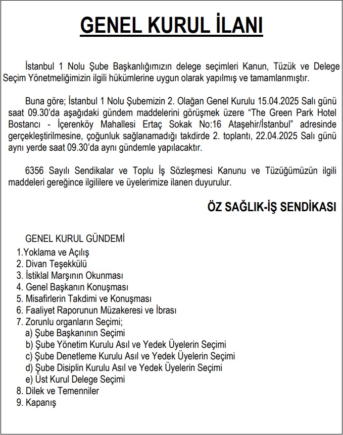 18 Mart 2025 İSTANBUL 1 NO’LU ŞUBE BAŞKANLIĞI GENEL KURUL İLANI Paylaş Facebook Twitter LinkedIn Pinterest