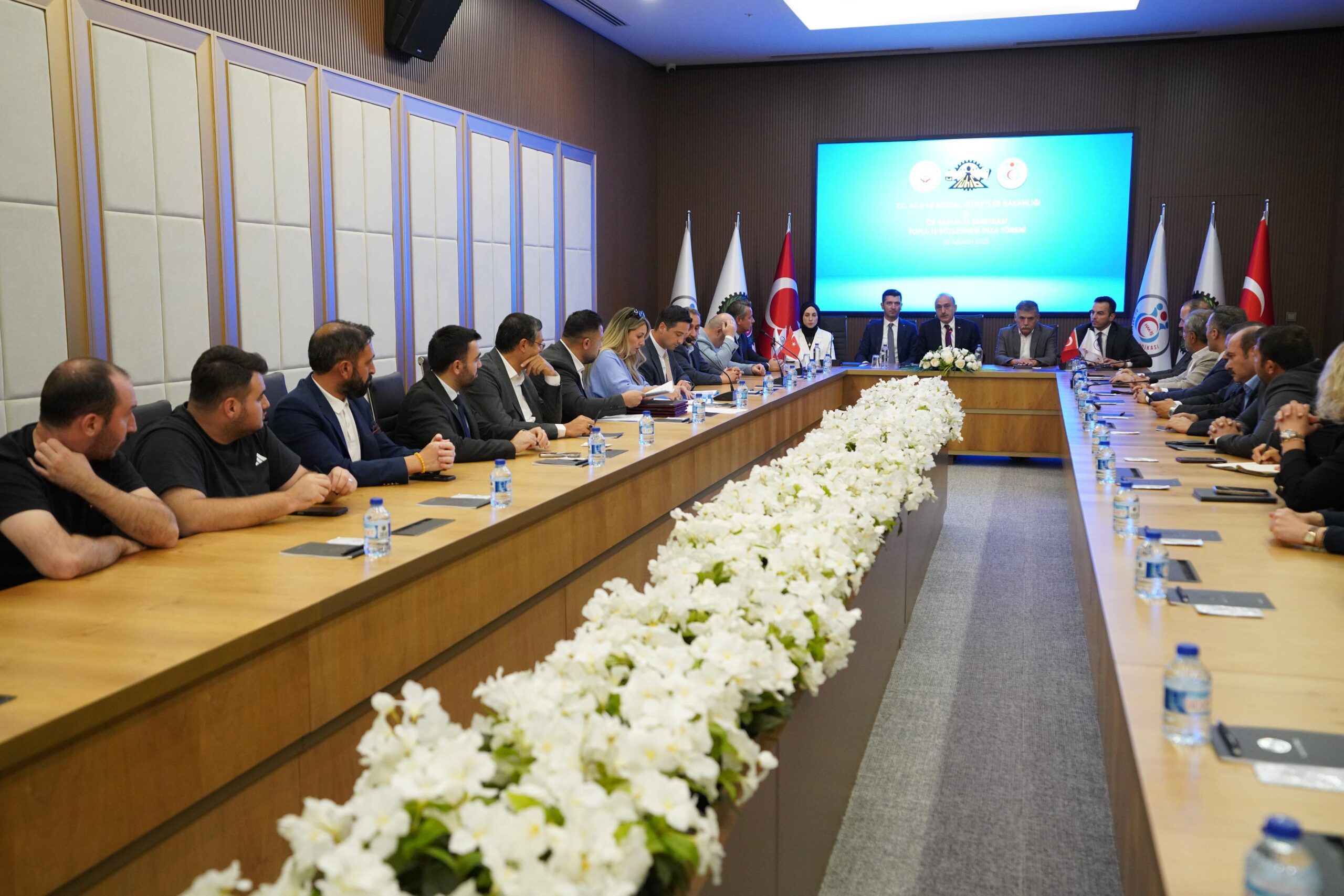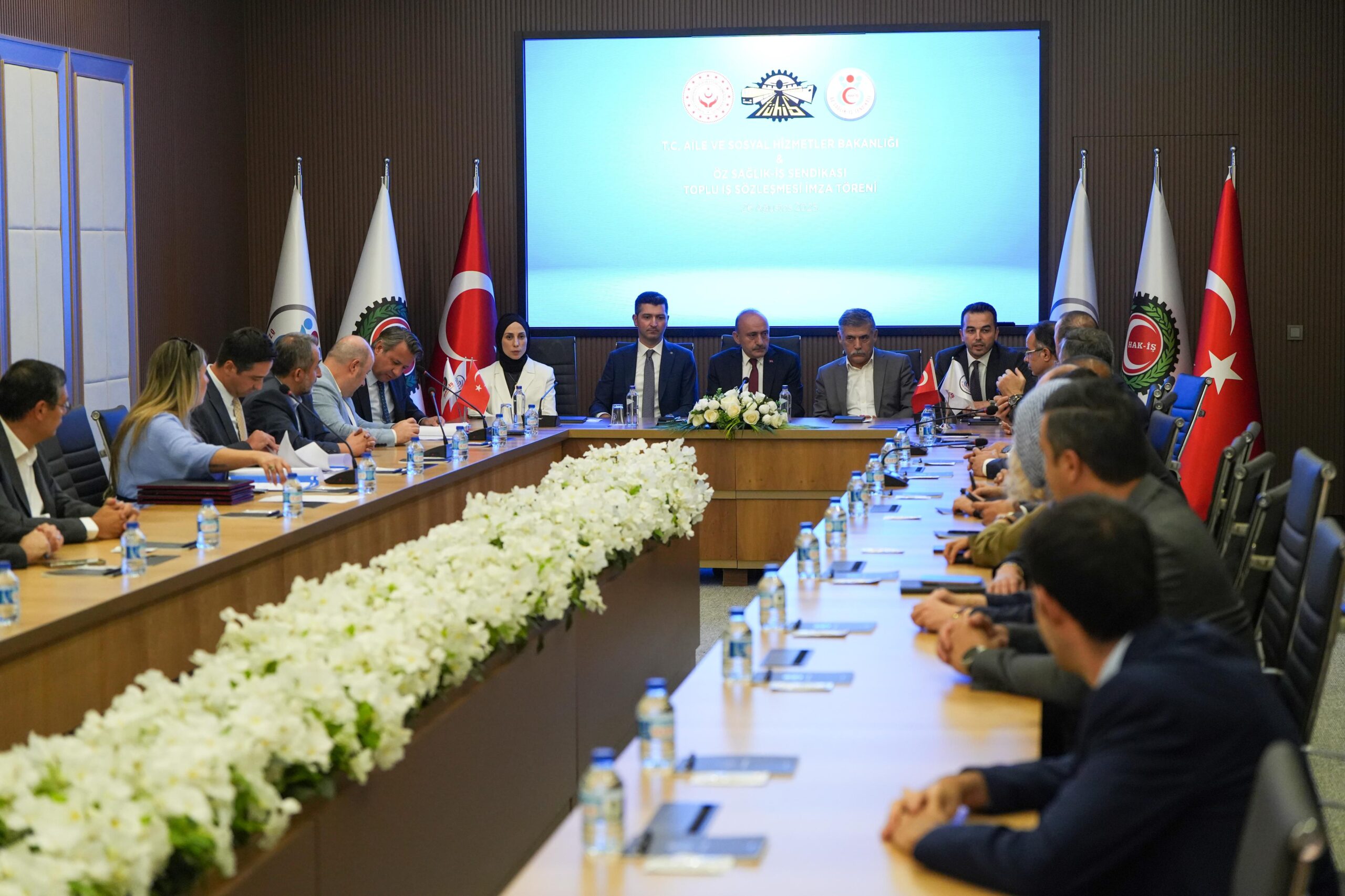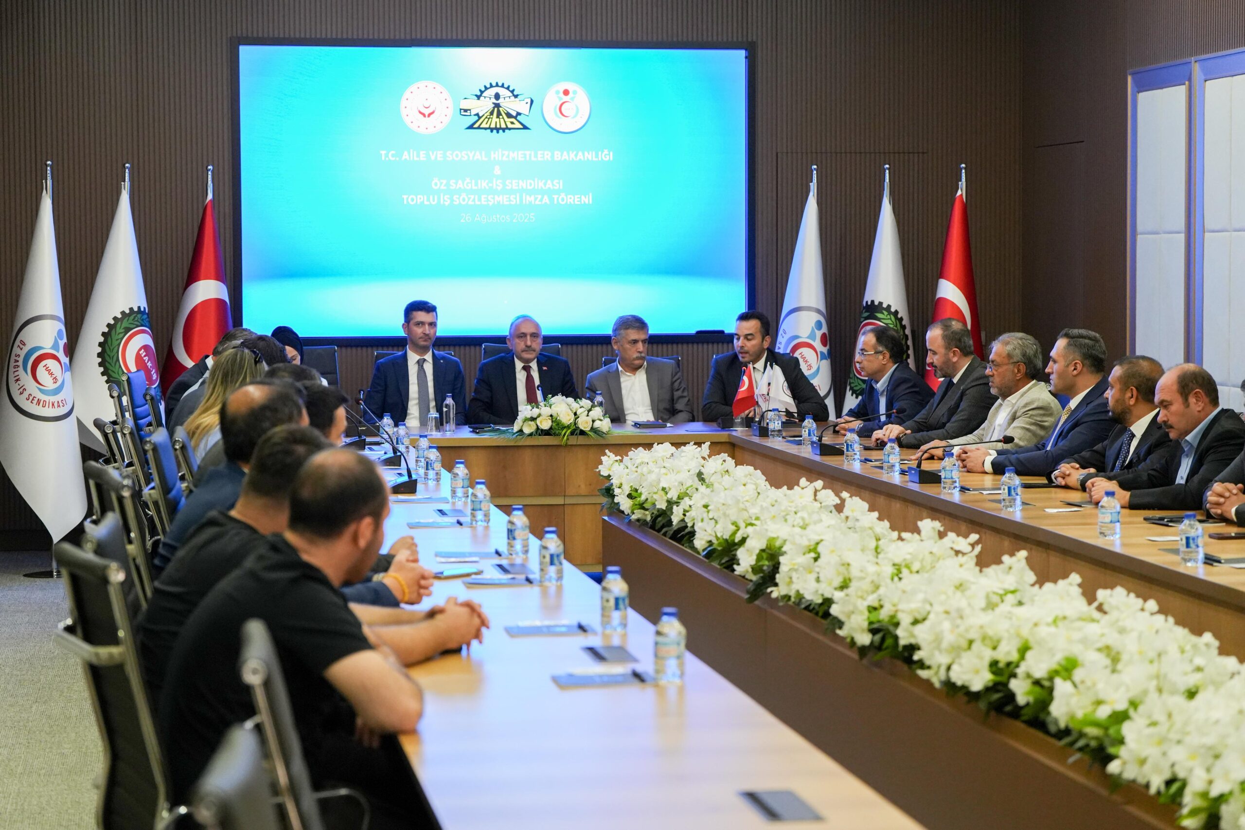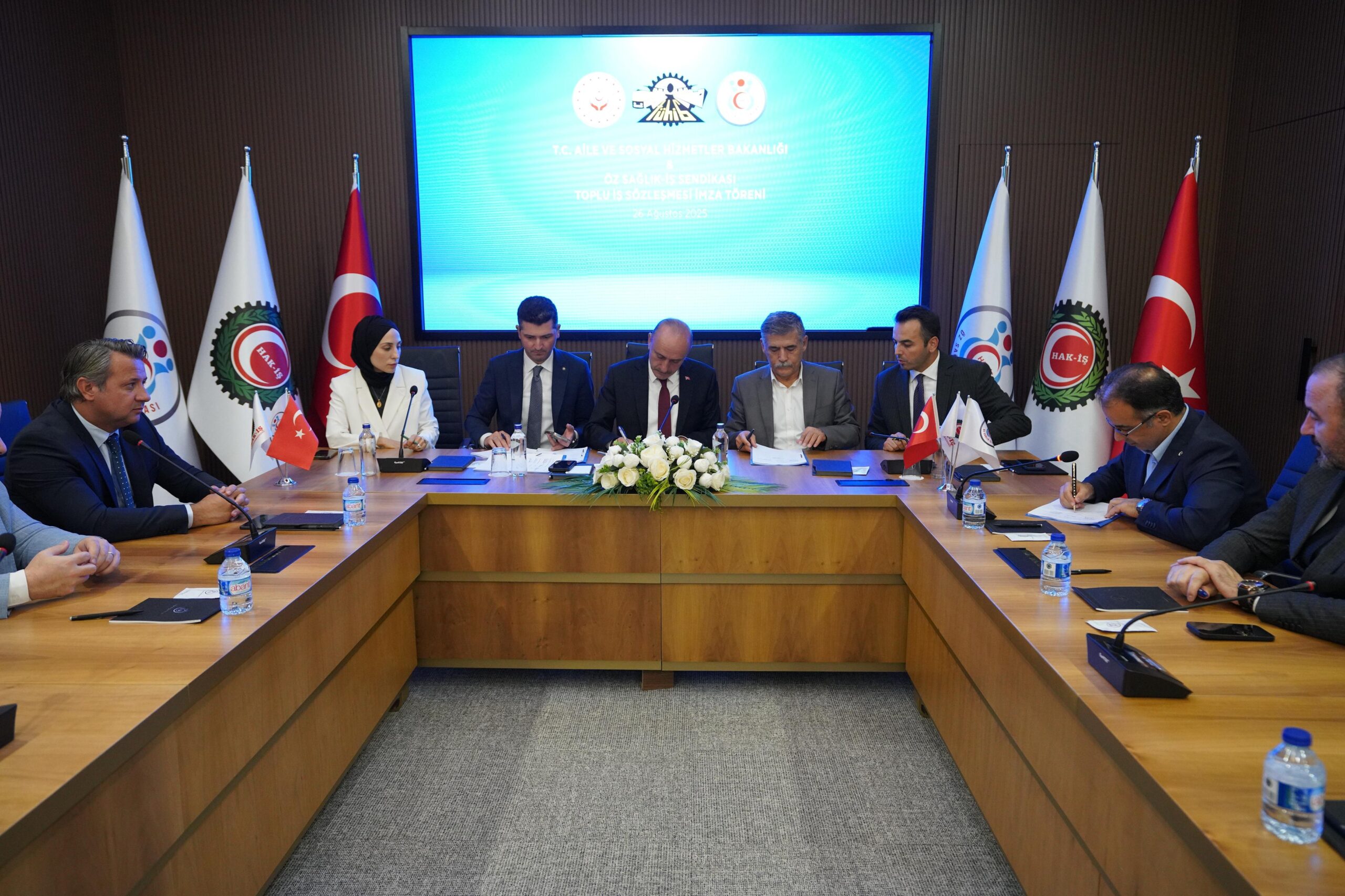 Aile ve Sosyal Hizmetler Bakanlığı adına Personel Genel Müdürü Hamza Gökhan Eryılmaz, Hukuk Hizmetleri Genel Müdürü Av. Özge Aydiş Toy, Strateji Geliştirme Daire Başkanı Mahmut Aslan, Personel Genel Müdür Yardımcısı Volkan Özdede, Hukuk Hizmetleri Genel Müdür Yardımcısı Dr. Mehmet Rauf Karslı, İşçi ve Sözleşmeli Personel Daire Başkanı Fırat Arslan, İşveren Sendikası TÜHİS adına ise Genel Sekreter Yardımcıları Hasan Yılmaz, Şerefettin Güler ve beraberindeki heyet törende hazır bulundu.