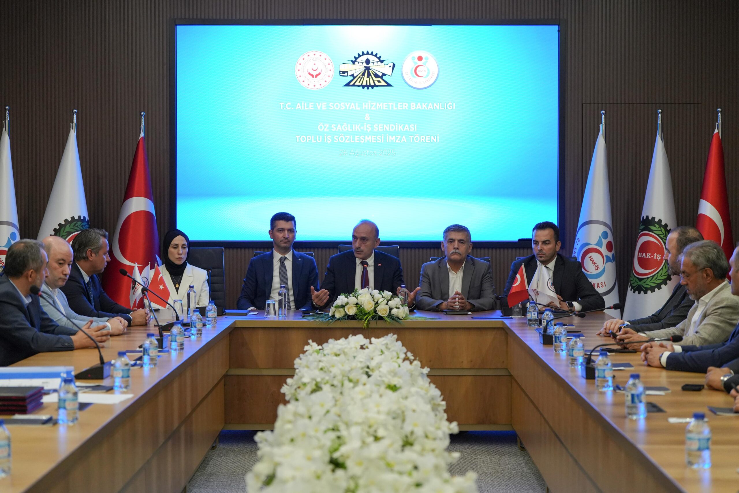 Törende Aile ve Sosyal Hizmetler Bakanlığı adına Personel Genel Müdürü Hamza Gökhan Eryılmaz, Hukuk Hizmetleri Genel Müdürü Av. Özge Aydiş Toy, Strateji Geliştirme Daire Başkanı Mahmut Aslan; İşveren Sendikası TÜHİS adına ise Genel Sekreter Yardımcıları Hasan Yılmaz, Şerefettin Güler de birer konuşma yaparak yeni dönem toplu iş sözleşmesinin hayırlı olması temennisinde bulundular.
