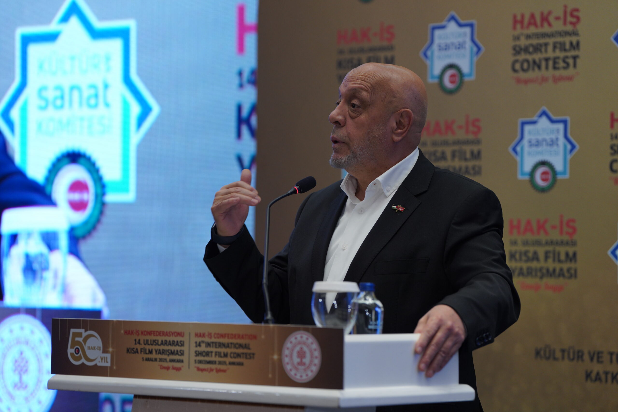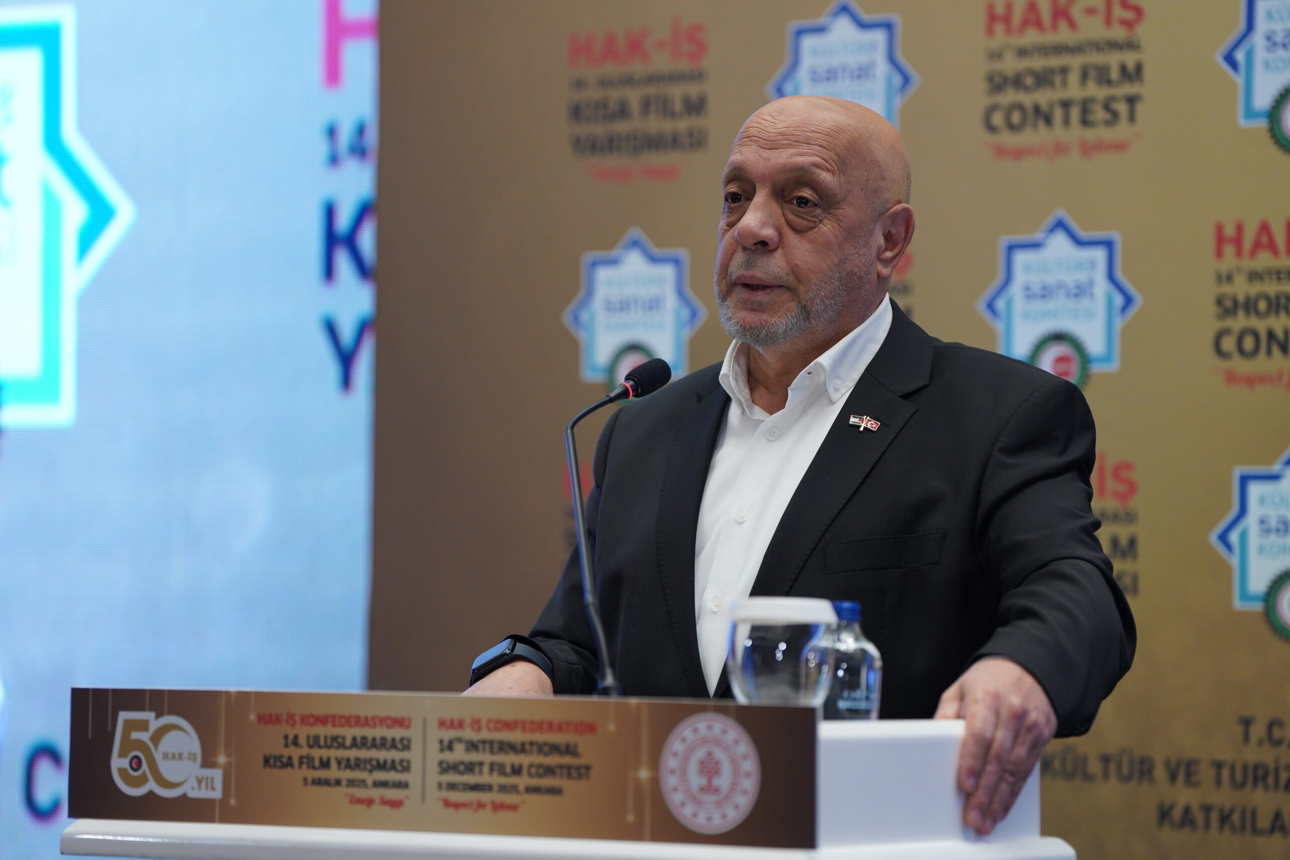 HAK-İŞ Genel Başkanı Mahmut Arslan, derisinin rengi, dili, inancı, mezhebi veya yaşadığı coğrafya ne olursa olsun hakları elinden alınan, dışlanan, aşağılanan ve yok sayılan tüm mazlum ve mağdurların HAK-İŞ’ten alacaklı olduğunu ifade etti. İnsanlığa karşı bir borcumuz olduğunu vurgulayan Arslan, HAK-İŞ’in yalnızca ülkemiz için değil, bölgemiz ve tüm insanlık için adalet mücadelesi yürüttüğünü, tasavvur ettiği dünyanın sınırlarının Türkiye ile sınırlı olmadığını söyledi. Arslan, yeni ve adil bir dünya inşası için verdikleri mücadelenin sürdüğünü belirterek, kısa film yarışmasının arka planında yer alan bu insani ve evrensel hedeflerin HAK-İŞ’i daha da cesaretlendirdiğini dile getirdi.