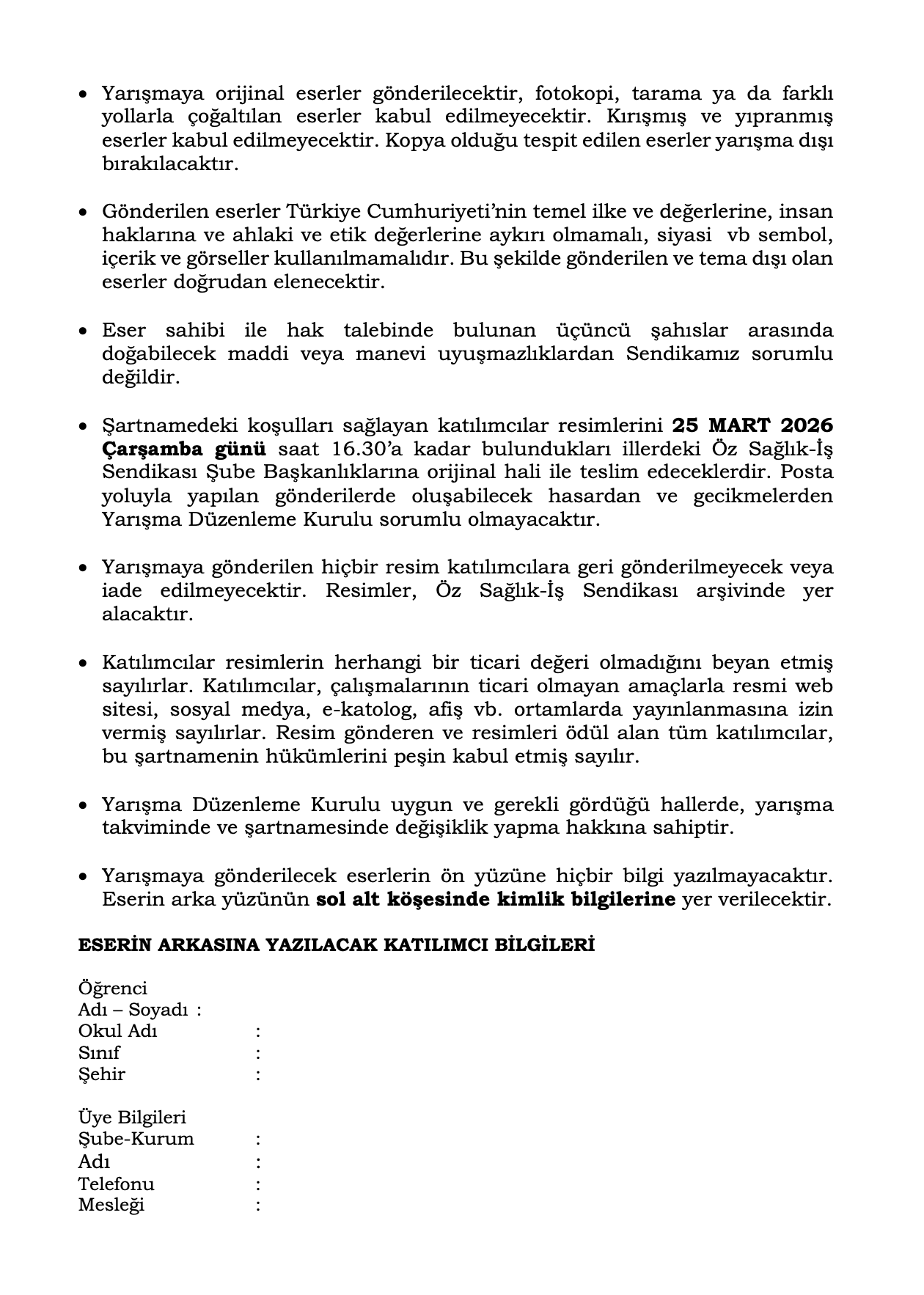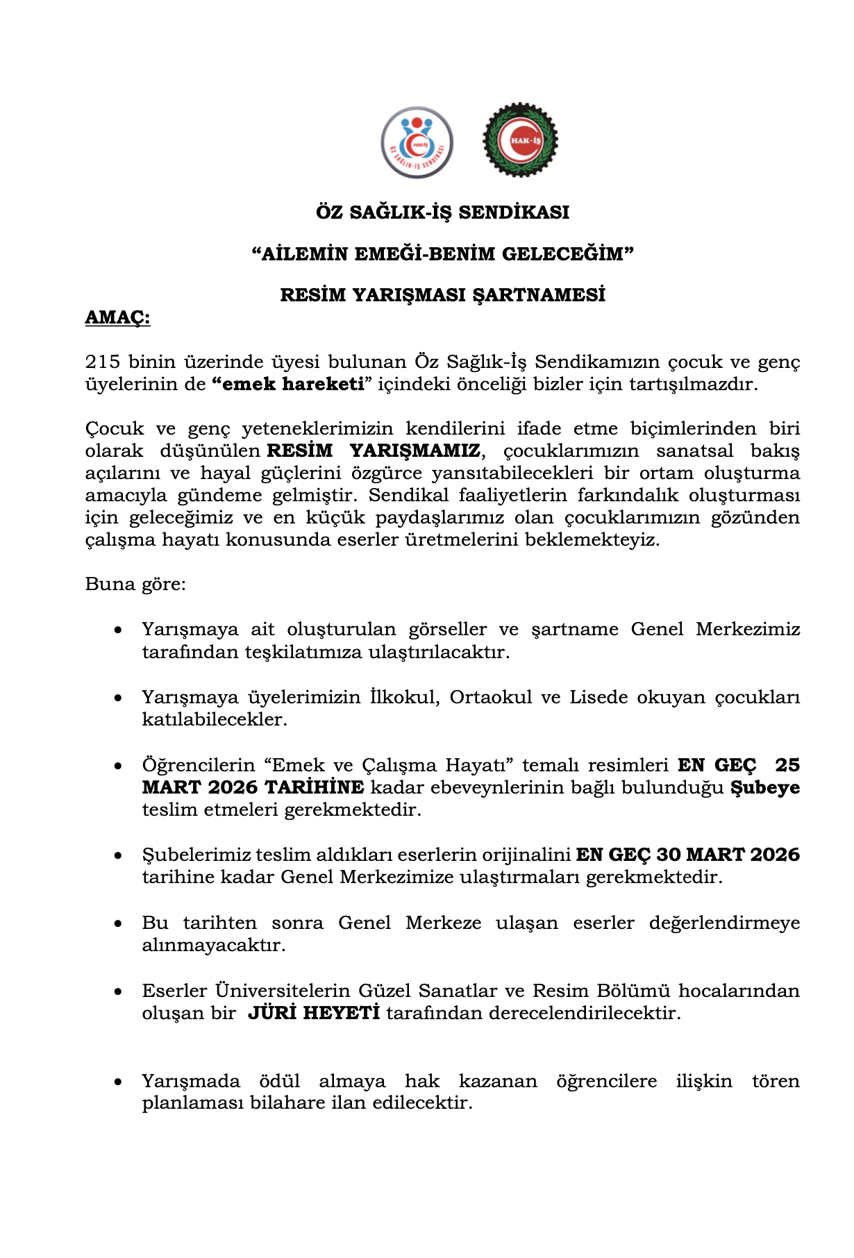 Öğrenciler, eserlerini 25 MART 2026 tarihine kadar ebeveynlerinin bağlı bulunduğu illerdeki Öz Sağlık-İş Sendikası Şube Başkanlıklarına teslim edebilecek. Yarışmaya ilişkin ayrıntılı bilgilere de yine Şube Başkanlıkları aracılığıyla ulaşılabilecek.
