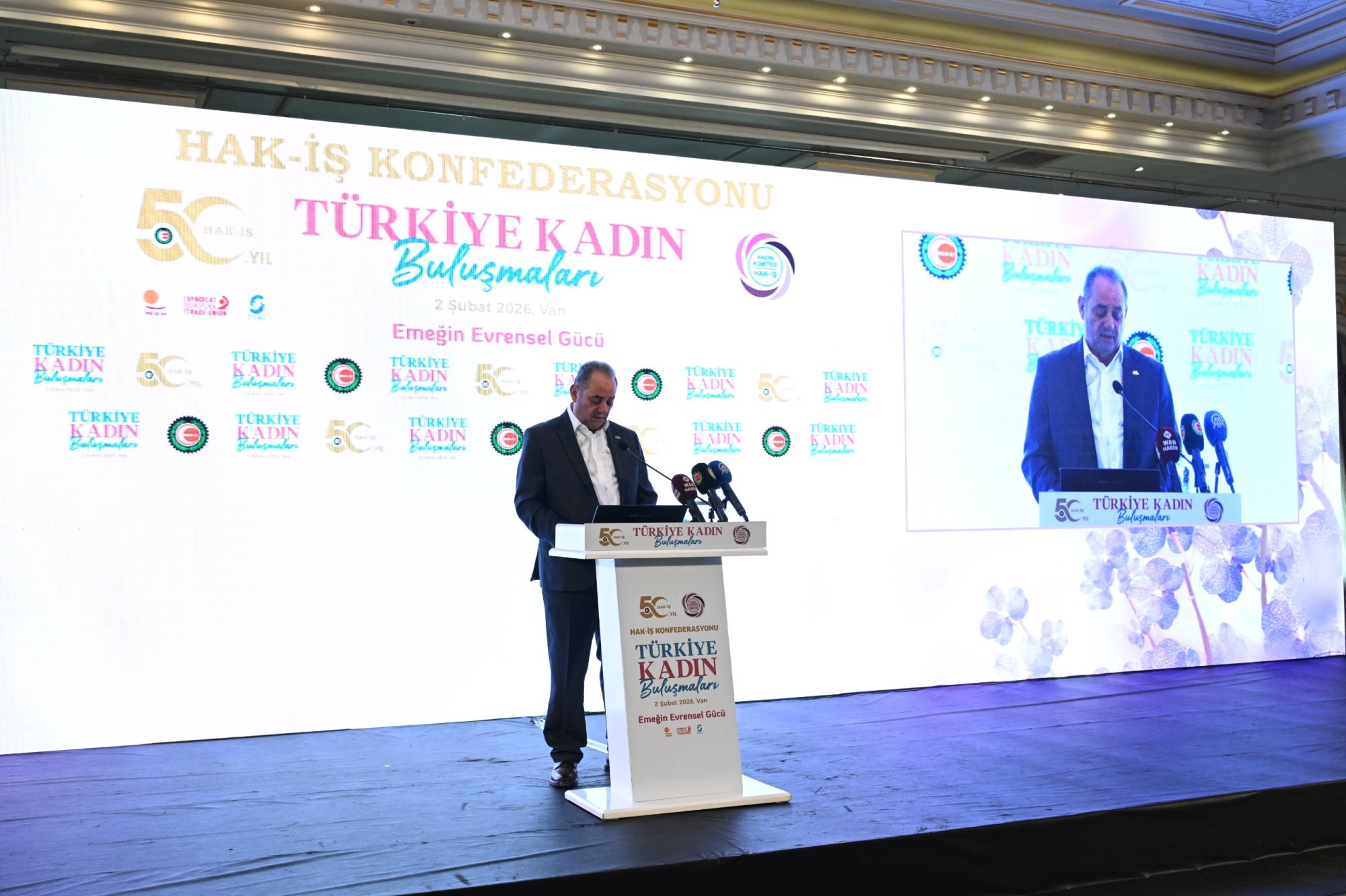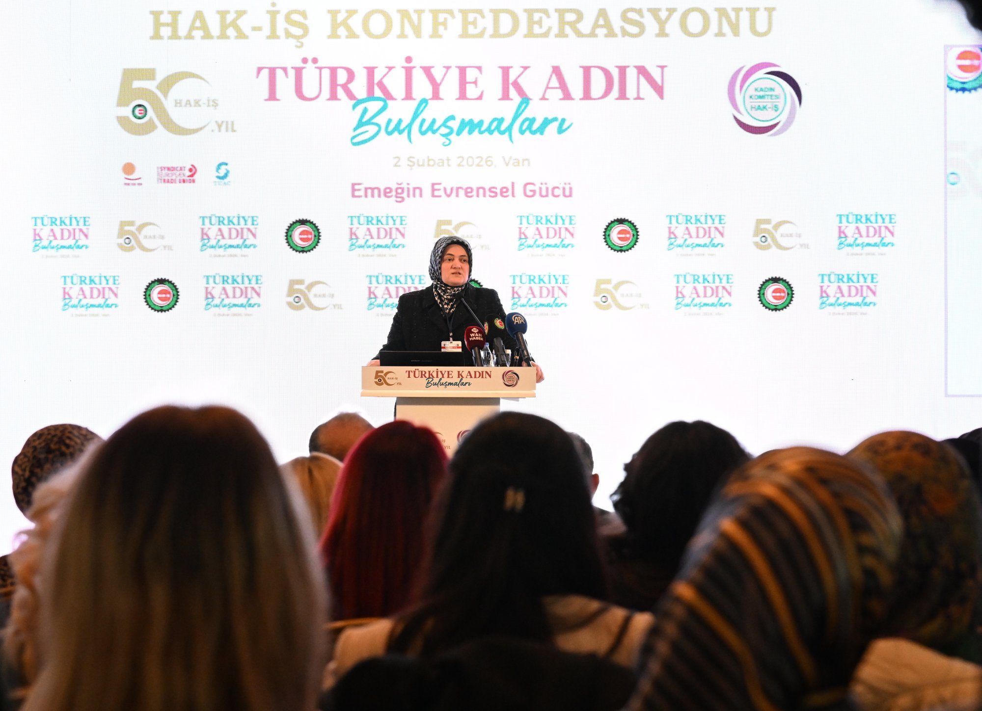 HAK-İŞ Genel Sekreter Yardımcısı ve HAK-İŞ Kadın Komitesi Başkanı Fatma Zengin, “Van’da olmanın bizim için çok özel ve derin bir anlamı var. Çünkü Van, sadece bir buluşmanın değil, aynı zamanda iki yıldır kararlılıkla sürdürülen onurlu bir mücadelenin adıdır. Van Büyükşehir ve İpekyolu Belediyesinde çalışan emekçi kardeşlerimizin hukuksuz ve gerekçesiz şekilde işten çıkarılmasıyla başlayan bu süreçte, HAK-İŞ olarak ilk günden itibaren emekçilerimizin yanında olduk. Dün olduğu gibi bugün de Van’da ve ülkemizin dört bir yanında; emeğin, adaletin ve örgütlü mücadelenin yanında durmaya devam edeceğiz” dedi.