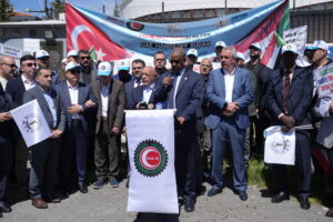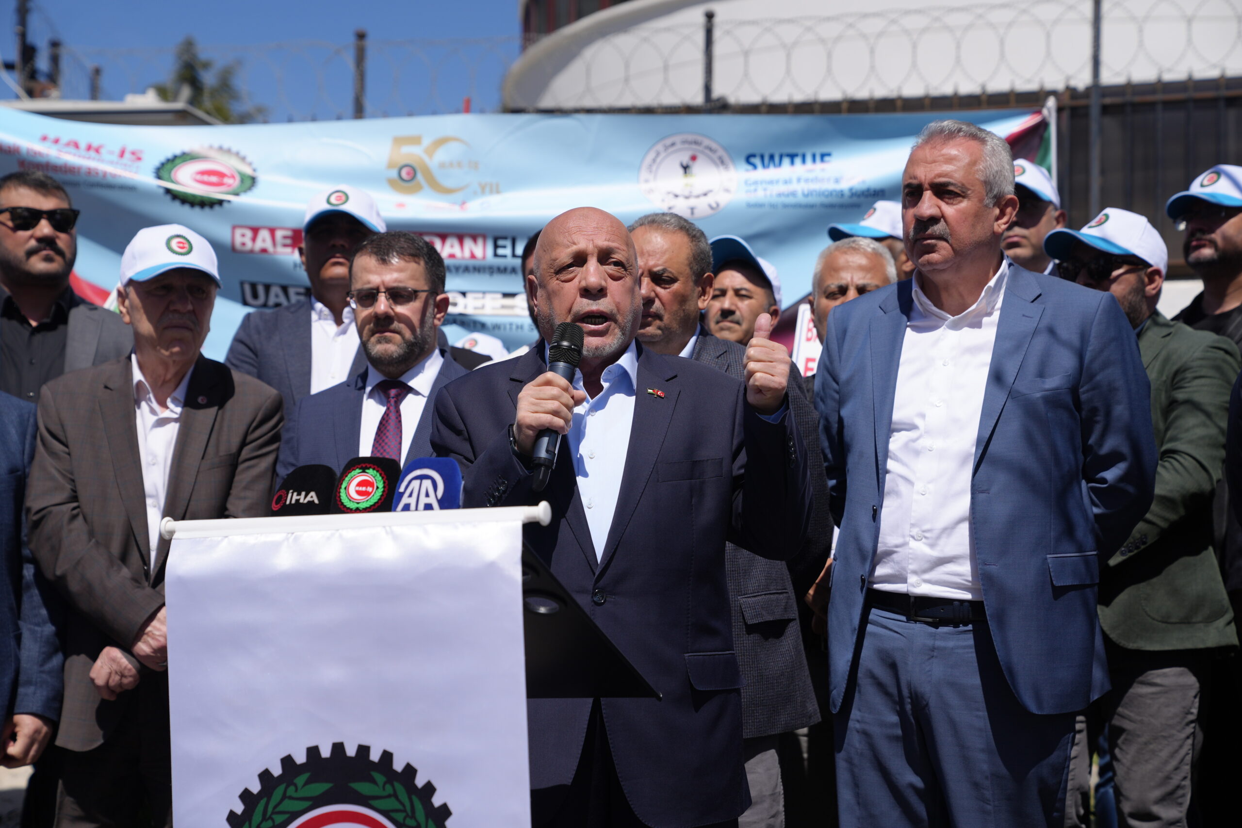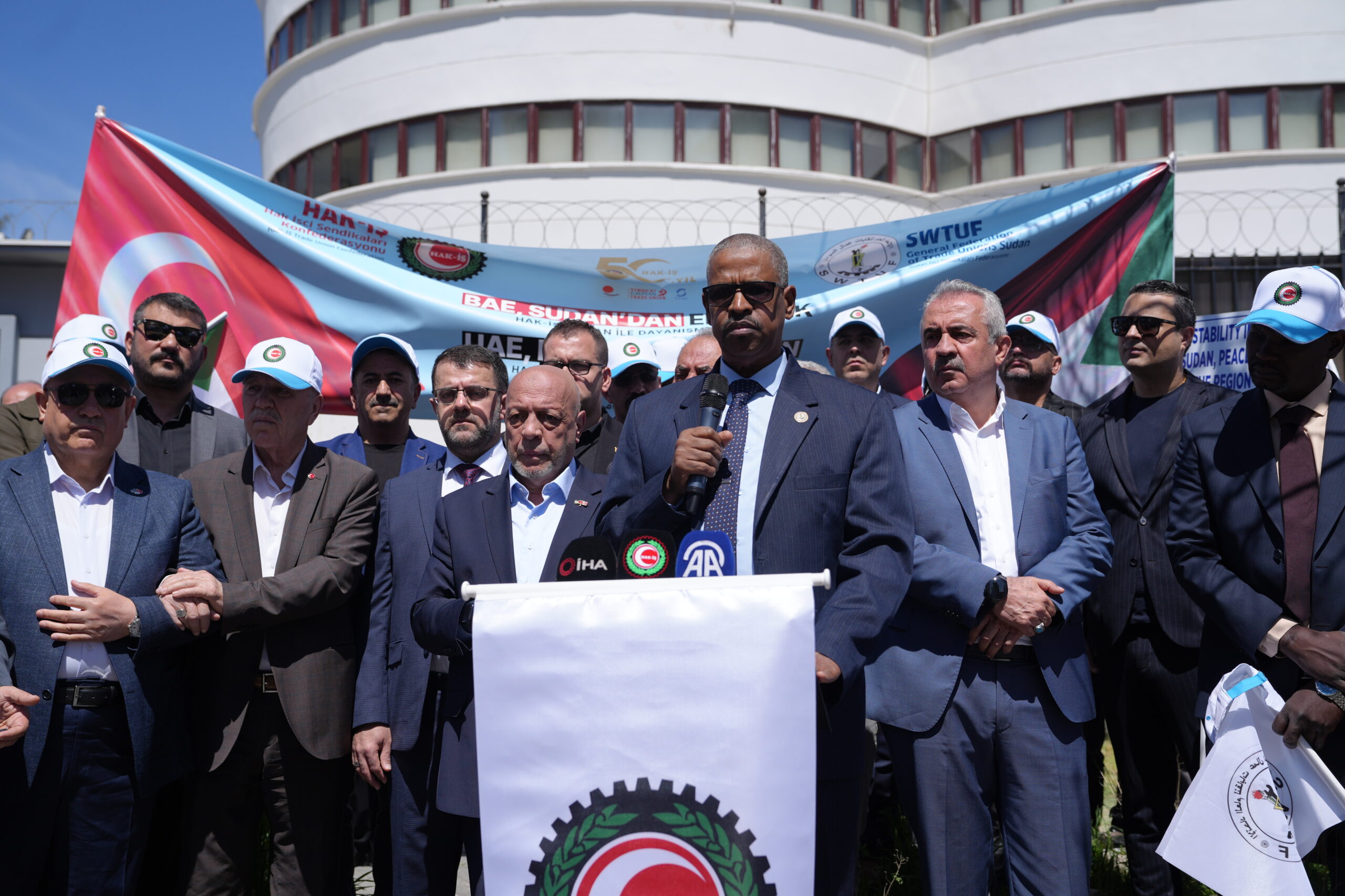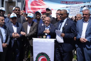 Eylemde, “BAE Sudan’dan elini çek, HAK-İŞ Sudan ile dayanışma içinde” pankartı açılarak, “BAE Sudan’dan defol”, “HAK-İŞ SWTUF omuz omuza”, “HAK-İŞ burada Sudan’ın yanında”, “Yaşasın Sudan dayanışmamız” sloganları atıldı.