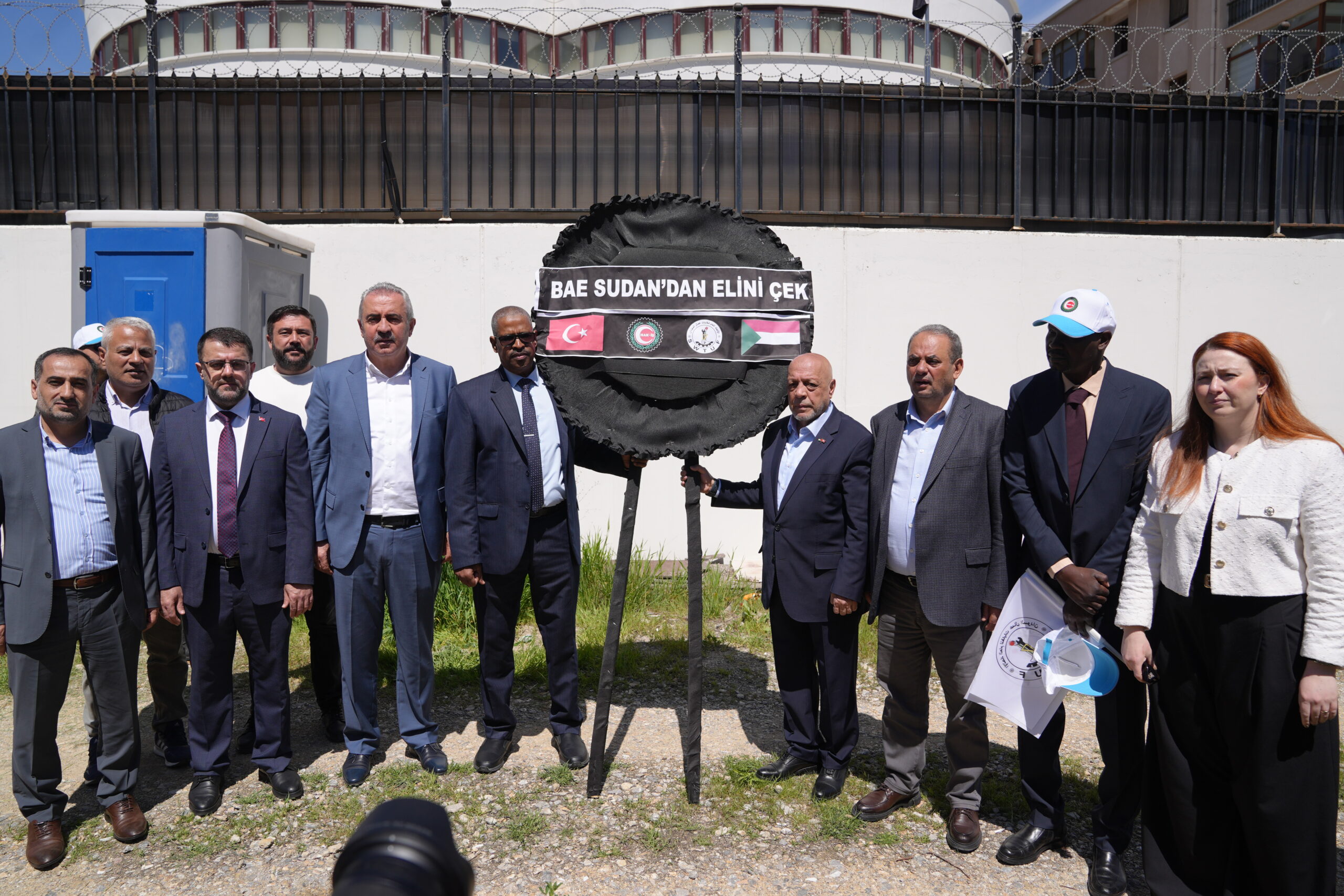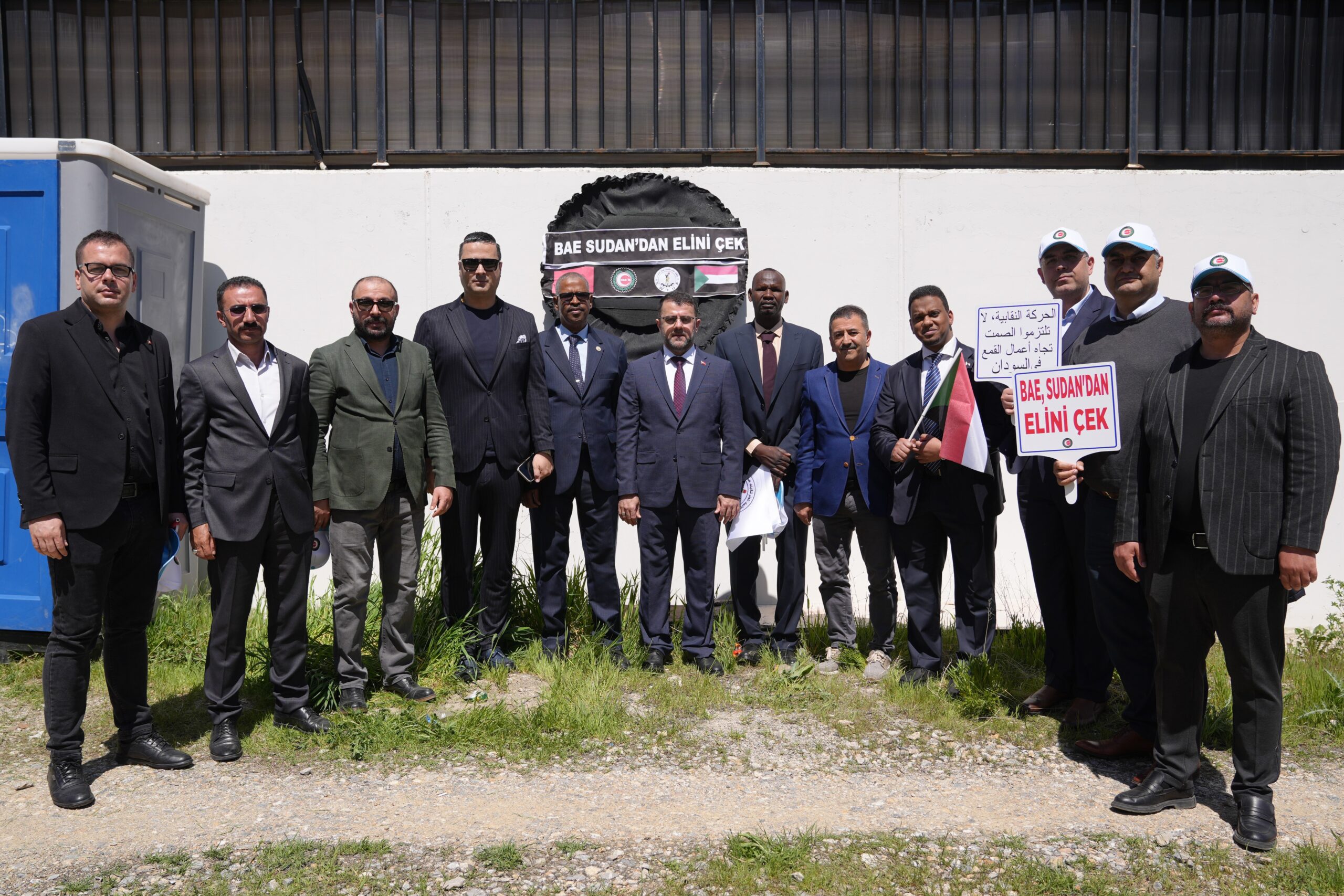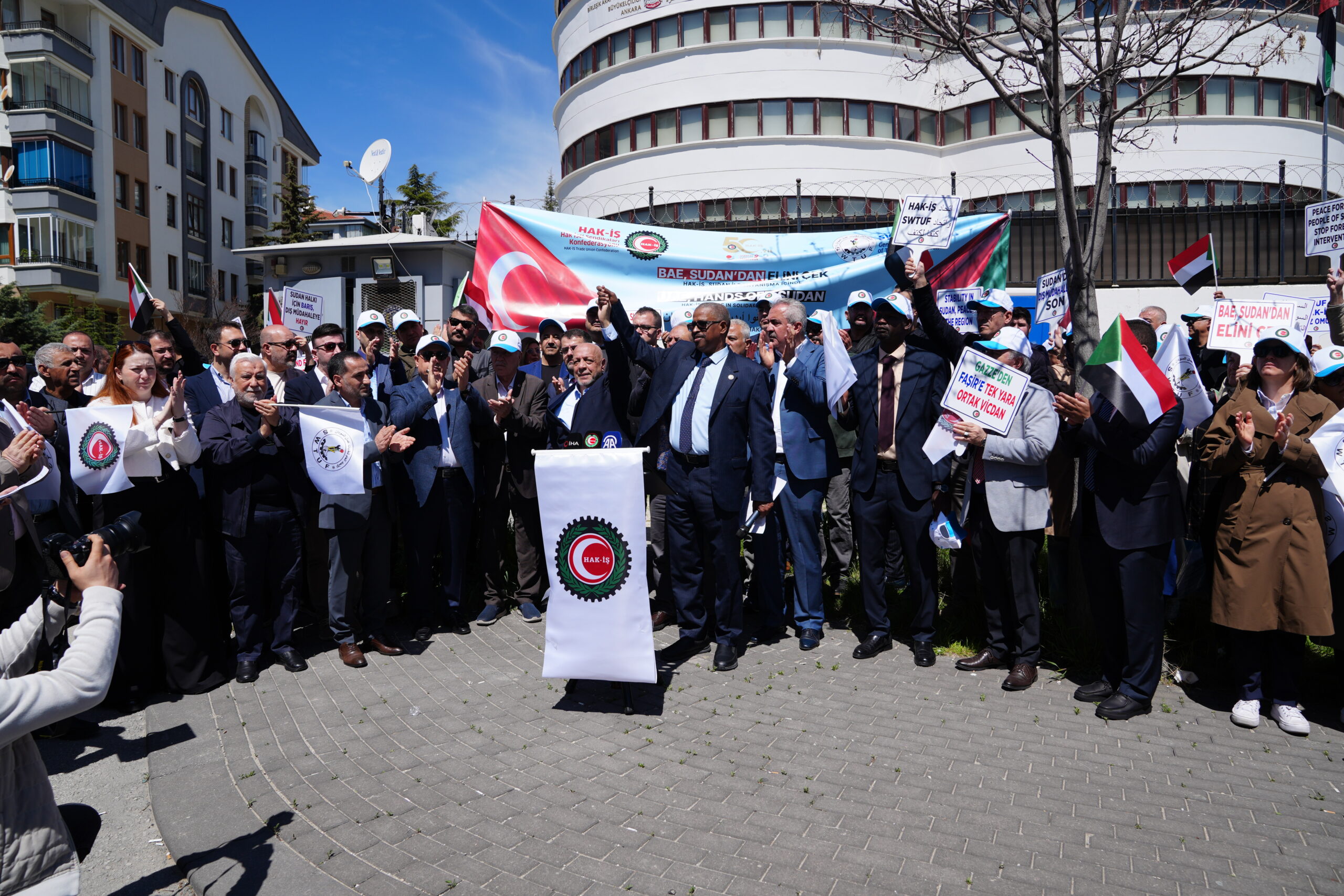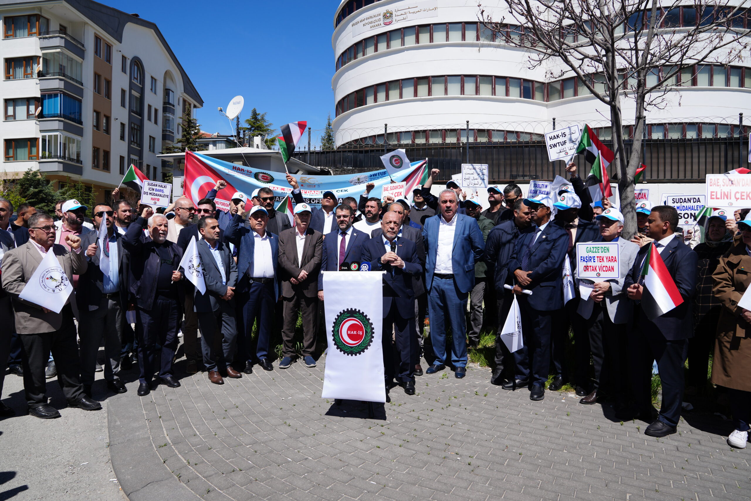 HAK-İŞ Genel Başkanı Mahmut Arslan’ın katılımıyla Birleşik Arap Emirlikleri (BAE) Ankara Büyükelçiliği önünde gerçekleştirilen eyleme; Sudan İşçi Sendikaları Konfederasyonu (SWTUF) Genel Başkanı Abdülkadir Sırrulhatme, HAK-İŞ Genel Başkan Yardımcıları Yunus Değirmenci, Halil Özdemir ve Mehmet Ali Kayabaşı, Genel Başkan Yardımcımız Fehmi Azboy, HAK-İŞ Genel Sekreteri Eda Akbulut, HAK-İŞ’e üye sendikaların genel başkan ve yöneticileri, Ankara şube başkanlarımız ve yönetim kurulu üyeleri ile üyelerimiz ve basın mensupları katıldı.