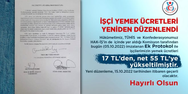 Hükümetimiz, TÜHİS ve Konfederasyonumuz HAK-İŞ’in de içinde yer aldığı Komisyon tarafından bugün (05.10.2022) imzalanan Ek Protokol ile işçilerimizin yemek ücretleri 17 TL’den, net 55 TL’ye yükseltilmiştir. Yeni düzenleme, 15.10.2022 tarihinden itibaren geçerli olacaktır. Hayırlı Olsun.