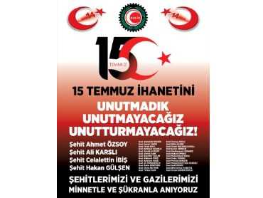 15 Temmuz Türkiye’yi işgal ve hain darbe girişimine kahramanca direnen, vatan, millet, devlet ve demokrasi için canlarını feda eden şehitlerimize bir kez daha Yüce Allah’tan rahmet, ailelerine sabır,gazilerimize şifalar diliyoruz.Şehit ve gazilerimizi minnetle anıyoruz. Demokrasi ve Milli Birlik Gününüz kutlu olsun.
